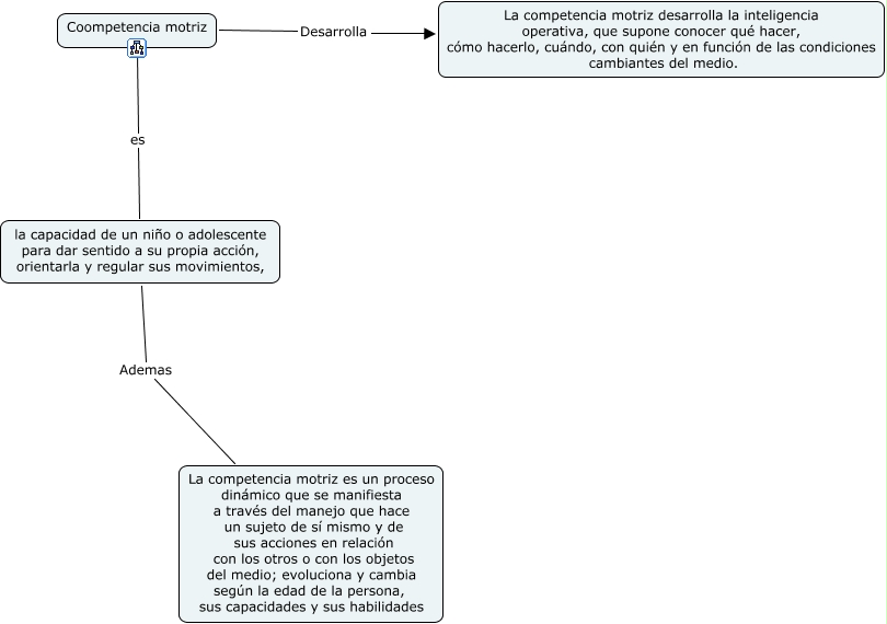 Este Cmap, tiene información relacionada con: competencia motriz, Coompetencia motriz es la capacidad de un niño o adolescente para dar sentido a su propia acción, orientarla y regular sus movimientos,, la capacidad de un niño o adolescente para dar sentido a su propia acción, orientarla y regular sus movimientos, Ademas La competencia motriz es un proceso dinámico que se manifiesta a través del manejo que hace un sujeto de sí mismo y de sus acciones en relación con los otros o con los objetos del medio; evoluciona y cambia según la edad de la persona, sus capacidades y sus habilidades, Coompetencia motriz Desarrolla La competencia motriz desarrolla la inteligencia operativa, que supone conocer qué hacer, cómo hacerlo, cuándo, con quién y en función de las condiciones cambiantes del medio.