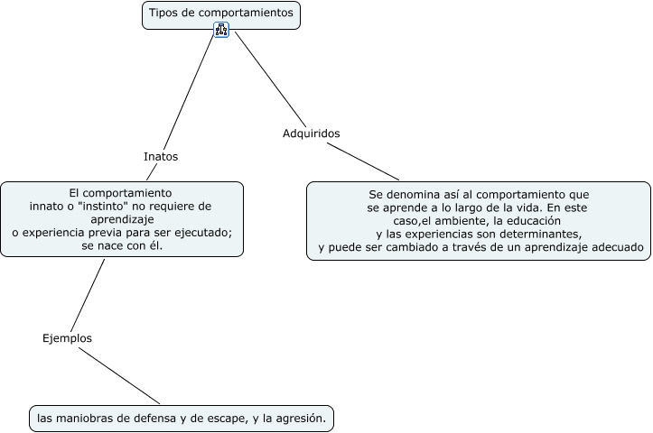 Este Cmap, tiene información relacionada con: tipos de comportamientos, Tipos de comportamientos Inatos El comportamiento innato o "instinto" no requiere de aprendizaje o experiencia previa para ser ejecutado; se nace con él., Tipos de comportamientos Adquiridos Se denomina así al comportamiento que se aprende a lo largo de la vida. En este caso,el ambiente, la educación y las experiencias son determinantes, y puede ser cambiado a través de un aprendizaje adecuado, El comportamiento innato o "instinto" no requiere de aprendizaje o experiencia previa para ser ejecutado; se nace con él. Ejemplos las maniobras de defensa y de escape, y la agresión.