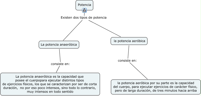 Este Cmap, tiene información relacionada con: potencia, Potencia Existen dos tipos de potencia La potencia anaeróbica, Potencia Existen dos tipos de potencia la potencia aeróbica, la potencia aeróbica consiste en: la potencia aeróbica por su parte es la capacidad del cuerpo, para ejecutar ejercicios de carácter físico, pero de larga duración, de tres minutos hacia arriba, La potencia anaeróbica consiste en: La potencia anaeróbica es la capacidad que posee el cuerpopara ejecutar distintos tipos de ejercicios físicos, los que se caracterizan por ser de corta duración, no por eso poco intensos, sino todo lo contrario, muy intensos en todo sentido