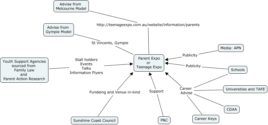This Concept Map, created with IHMC CmapTools, has information related to: Parent Expo, Advise from Melcourne Model http://teenageexpo.com.au/website/information/parents Parent Expo or Teenage Expo, Media: APN Publicity Parent Expo or Teenage Expo, Advise from Gympie Model St Vincents, Gympie Parent Expo or Teenage Expo, Universities and TAFE Career Advise Parent Expo or Teenage Expo, P&C Support Parent Expo or Teenage Expo, Career Keys Career Advise Parent Expo or Teenage Expo, Sunshine Coast Council Fundeing and Venue in-kind Parent Expo or Teenage Expo, Schools Career Advise Parent Expo or Teenage Expo, CDAA Career Advise Parent Expo or Teenage Expo, Schools Publicity Parent Expo or Teenage Expo, Youth Support Agencies sourced from Family Law and Parent Action Research Stall holders Events Talks Information Flyers Parent Expo or Teenage Expo
