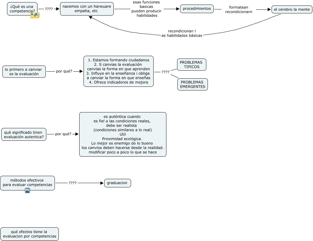 Este Cmap, tiene información relacionada con: calos monereo evaluacion competencias, què significado tinen evaluación autentica? por qué? es auténtica cuando es fiel a las condiciones reales, debe ser realista (condiciones similares a lo real) Util Proximidad ecológica. Lo mejor es enemigo de lo bueno los canvios deben hacerse desde la realidad. modificar poco a poco lo que se hace, 1. Estamos formando ciudadanos 2. S canvias la evaluación canvias la forma en que aprenden 3. Influye en la enseñanza i obliga a canviar la forma en que enseñas 4. Ofrece indicadores de mejora ???? PROBLEMAS EMERGENTES, ¿Qué es una competencia? ???? nacemos con un harwuare empatia, etc, métodos efectivos para evaluar competencias ???? graduacion, procedimientos formatean recondicionarn el cerebro la mente, nacemos con un harwuare empatia, etc esas funciones basicas pueden producir habilidades procedimientos, PROBLEMAS TIPICOS ???? PROBLEMAS EMERGENTES, lo primero a canviar es la evaluación por qué? 1. Estamos formando ciudadanos 2. S canvias la evaluación canvias la forma en que aprenden 3. Influye en la enseñanza i obliga a canviar la forma en que enseñas 4. Ofrece indicadores de mejora, el cerebro la mente recondicionan l as habilidades básicas nacemos con un harwuare empatia, etc
