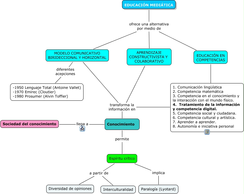 Este Cmap, tiene información relacionada con: Educación mediática TRABAJO FINAL, EDUCACIÓN MEDIÁTICA ofrece una alternativa por medio de EDUCACIÓN EN COMPETENCIAS, EDUCACIÓN MEDIÁTICA ofrece una alternativa por medio de MODELO COMUNICATIVO BIRIDECCIONAL Y HORIZONTAL, Conocimiento llega a Sociedad del conocimiento, MODELO COMUNICATIVO BIRIDECCIONAL Y HORIZONTAL transforma la información en Conocimiento, 1. Comunicación lingüística 2. Competencia matemática 3. Competencia en el conocimiento y la interacción con el mundo físico. 4. Tratamiento de la información y competencia digital. 5. Competencia social y ciudadana. 6. Competencia cultural y artística. 7. Aprender a aprender. 8. Autonomía e iniciativa personal transforma la información en Conocimiento, Espíritu crítico a partir de Interculturalidad, MODELO COMUNICATIVO BIRIDECCIONAL Y HORIZONTAL diferentes acepciones -1950 Lenguaje Total (Antoine Vallet) -1970 Emirec (Cloutier) -1980 Prosumer (Alvin Toffler), Paralogía (Lyotard) implica Espíritu crítico, APRENDIZAJE CONSTRUCTIVISTA Y COLABORATIVO transforma la información en Conocimiento, EDUCACIÓN EN COMPETENCIAS | 1. Comunicación lingüística 2. Competencia matemática 3. Competencia en el conocimiento y la interacción con el mundo físico. 4. Tratamiento de la información y competencia digital. 5. Competencia social y ciudadana. 6. Competencia cultural y artística. 7. Aprender a aprender. 8. Autonomía e iniciativa personal, EDUCACIÓN MEDIÁTICA ofrece una alternativa por medio de APRENDIZAJE CONSTRUCTIVISTA Y COLABORATIVO, Conocimiento permite Espíritu crítico, Espíritu crítico a partir de Diversidad de opiniones