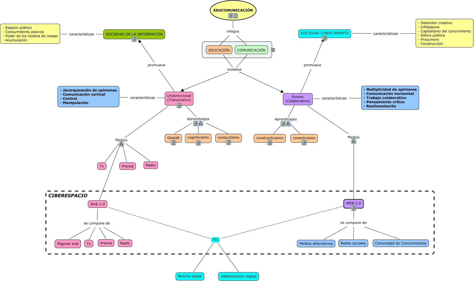 Este Cmap, tiene información relacionada con: Educomunicación - TRABAJO FINAL, WEB 2.0 se compone de Medios alternativos, COMUNICACIÓN modelos Emirec (Colaborativo), EDUCOMUNICACIÓN integra EDUCACIÓN, EDUCOMUNICACIÓN integra COMUNICACIÓN, Web 1.0 TIC Alfabetización digital, Emirec (Colaborativo) Medios WEB 2.0, Unidireccional (Transmisivo) Aprendizajes conductismo, Web 1.0 se compone de Prensa, Web 1.0 TIC Brecha digital, SOCIEDAD CONOCIMIENTO características - Desorden creativo - Infobasura - Capitalismo del conocimiento - Esfera pública - Prosumers - Construcción, EDUCACIÓN modelos Unidireccional (Transmisivo), Unidireccional (Transmisivo) Medios Tv, Emirec (Colaborativo) promueve SOCIEDAD CONOCIMIENTO, Web 1.0 se compone de Radio, WEB 2.0 se compone de Comunidad de Conocimientos, Unidireccional (Transmisivo) Aprendizajes Gestalt, WEB 2.0 TIC Brecha digital, EDUCACIÓN modelos Emirec (Colaborativo), Emirec (Colaborativo) Aprendizajes conectivismo, COMUNICACIÓN modelos Unidireccional (Transmisivo)