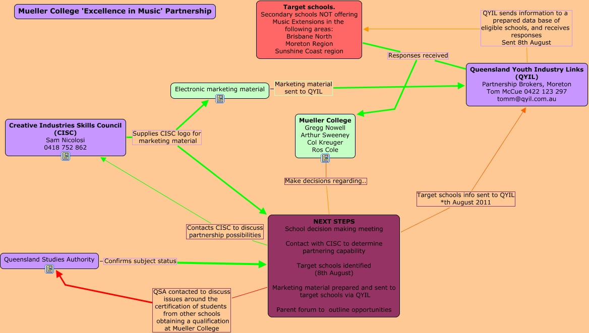This Concept Map, created with IHMC CmapTools, has information related to: Mueller 'Excellence in Music' Partnership, Mueller College Gregg Nowell Arthur Sweeney Col Kreuger Ros Cole Make decisions regarding.. NEXT STEPS School decision making meeting Contact with CISC to determine partnering capability Target schools identified (8th August) Marketing material prepared and sent to target schools via QYIL Parent forum to outline opportunities, NEXT STEPS School decision making meeting Contact with CISC to determine partnering capability Target schools identified (8th August) Marketing material prepared and sent to target schools via QYIL Parent forum to outline opportunities Contacts CISC to discuss partnership possibilities Creative Industries Skills Council (CISC) Sam Nicolosi 0418 752 862, Target schools. Secondary schools NOT offering Music Extensions in the following areas: Brisbane North Moreton Region Sunshine Coast region Responses received Queensland Youth Industry Links (QYIL) Partnership Brokers, Moreton Tom McCue 0422 123 297 tomm@qyil.com.au, Target schools. Secondary schools NOT offering Music Extensions in the following areas: Brisbane North Moreton Region Sunshine Coast region Responses received Mueller College Gregg Nowell Arthur Sweeney Col Kreuger Ros Cole, NEXT STEPS School decision making meeting Contact with CISC to determine partnering capability Target schools identified (8th August) Marketing material prepared and sent to target schools via QYIL Parent forum to outline opportunities Target schools info sent to QYIL *th August 2011 Queensland Youth Industry Links (QYIL) Partnership Brokers, Moreton Tom McCue 0422 123 297 tomm@qyil.com.au, Creative Industries Skills Council (CISC) Sam Nicolosi 0418 752 862 Supplies CISC logo for marketing material NEXT STEPS School decision making meeting Contact with CISC to determine partnering capability Target schools identified (8th August) Marketing material prepared and sent to target schools via QYIL Parent forum to outline opportunities, NEXT STEPS School decision making meeting Contact with CISC to determine partnering capability Target schools identified (8th August) Marketing material prepared and sent to target schools via QYIL Parent forum to outline opportunities QSA contacted to discuss issues around the certification of students from other schools obtaining a qualification at Mueller College Queensland Studies Authority, Queensland Youth Industry Links (QYIL) Partnership Brokers, Moreton Tom McCue 0422 123 297 tomm@qyil.com.au QYIL sends information to a prepared data base of eligible schools, and receives responses Sent 8th August Target schools. Secondary schools NOT offering Music Extensions in the following areas: Brisbane North Moreton Region Sunshine Coast region, Electronic marketing material Marketing material sent to QYIL Queensland Youth Industry Links (QYIL) Partnership Brokers, Moreton Tom McCue 0422 123 297 tomm@qyil.com.au, Queensland Studies Authority Confirms subject status NEXT STEPS School decision making meeting Contact with CISC to determine partnering capability Target schools identified (8th August) Marketing material prepared and sent to target schools via QYIL Parent forum to outline opportunities, Creative Industries Skills Council (CISC) Sam Nicolosi 0418 752 862 Supplies CISC logo for marketing material Electronic marketing material