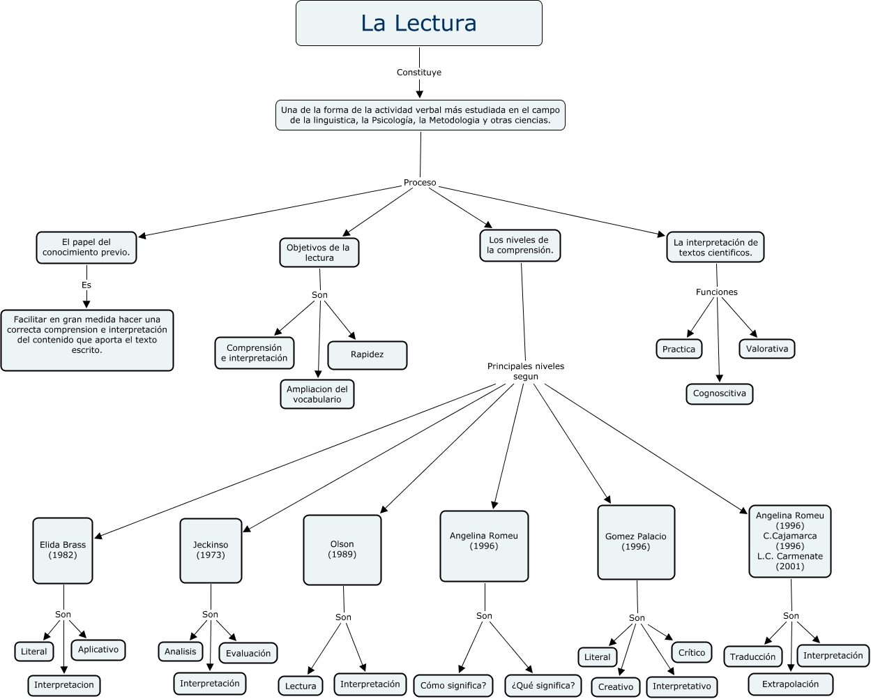 Este Cmap, tiene información relacionada con: Mapa Conceptual, Olson (1989) Son Interpretación, Angelina Romeu (1996) C.Cajamarca (1996) L.C. Carmenate (2001) Son Interpretación, Jeckinso (1973) Son Interpretación, Gomez Palacio (1996) Son Crítico, La interpretación de textos cientificos. Funciones Practica, Gomez Palacio (1996) Son Creativo, Una de la forma de la actividad verbal más estudiada en el campo de la linguistica, la Psicología, la Metodologia y otras ciencias. Proceso Objetivos de la lectura, Angelina Romeu (1996) Son Cómo significa?, El papel del conocimiento previo. Es Facilitar en gran medida hacer una correcta comprension e interpretación del contenido que aporta el texto escrito., Objetivos de la lectura Son Comprensión e interpretación, Angelina Romeu (1996) Son ¿Qué significa?, Los niveles de la comprensión. Principales niveles segun Jeckinso (1973), La interpretación de textos cientificos. Funciones Valorativa, Objetivos de la lectura Son Ampliacion del vocabulario, Una de la forma de la actividad verbal más estudiada en el campo de la linguistica, la Psicología, la Metodologia y otras ciencias. Proceso La interpretación de textos cientificos., La interpretación de textos cientificos. Funciones Cognoscitiva, Jeckinso (1973) Son Evaluación, Elida Brass (1982) Son Literal, Olson (1989) Son Lectura, Una de la forma de la actividad verbal más estudiada en el campo de la linguistica, la Psicología, la Metodologia y otras ciencias. Proceso El papel del conocimiento previo.