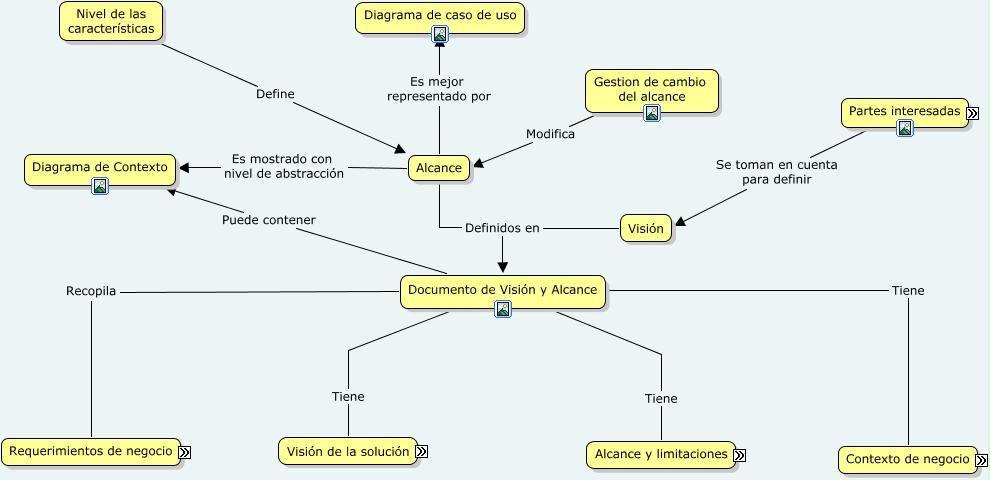 Este Cmap, tiene información relacionada con: Vision, Documento de Visión y Alcance Puede contener Diagrama de Contexto, Partes interesadas Se toman en cuenta para definir Visión, Documento de Visión y Alcance Recopila Requerimientos de negocio, Documento de Visión y Alcance Tiene Alcance y limitaciones, Alcance Definidos en Visión, Alcance Definidos en Documento de Visión y Alcance, Documento de Visión y Alcance Tiene Contexto de negocio, Alcance Es mostrado con nivel de abstracción Diagrama de Contexto, Alcance Es mejor representado por Diagrama de caso de uso, Nivel de las características Define Alcance, Visión de la solución Tiene Documento de Visión y Alcance, Gestion de cambio del alcance Modifica Alcance