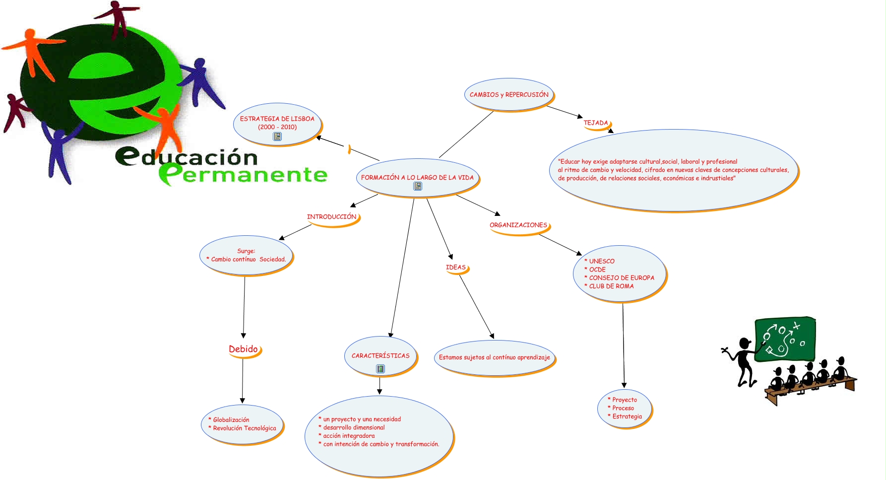 Este Cmap, tiene información relacionada con: org formacion a lo largo de la vida con i magenes.cmap, Surge: * Cambio contínuo Sociedad. Debido * Globalización * Revolución Tecnológica, FORMACIÓN A LO LARGO DE LA VIDA ORGANIZACIONES * UNESCO * OCDE * CONSEJO DE EUROPA * CLUB DE ROMA, FORMACIÓN A LO LARGO DE LA VIDA IDEAS Estamos sujetos al contínuo aprendizaje, FORMACIÓN A LO LARGO DE LA VIDA ???? CAMBIOS y REPERCUSIÓN, FORMACIÓN A LO LARGO DE LA VIDA ESTRATEGIA DE LISBOA (2000 - 2010), FORMACIÓN A LO LARGO DE LA VIDA INTRODUCCIÓN Surge: * Cambio contínuo Sociedad., CAMBIOS y REPERCUSIÓN TEJADA "Educar hoy exige adaptarse cultural,social, laboral y profesional al ritmo de cambio y velocidad, cifrado en nuevas claves de concepciones culturales, de producción, de relaciones sociales, económicas e indrustiales", FORMACIÓN A LO LARGO DE LA VIDA ???? CARACTERÍSTICAS, FORMACIÓN A LO LARGO DE LA VIDA ESTRATEGIA DE LISBOA (2000 - 2010), CARACTERÍSTICAS ???? * un proyecto y una necesidad * desarrollo dimensional * acción integradora * con intención de cambio y transformación.