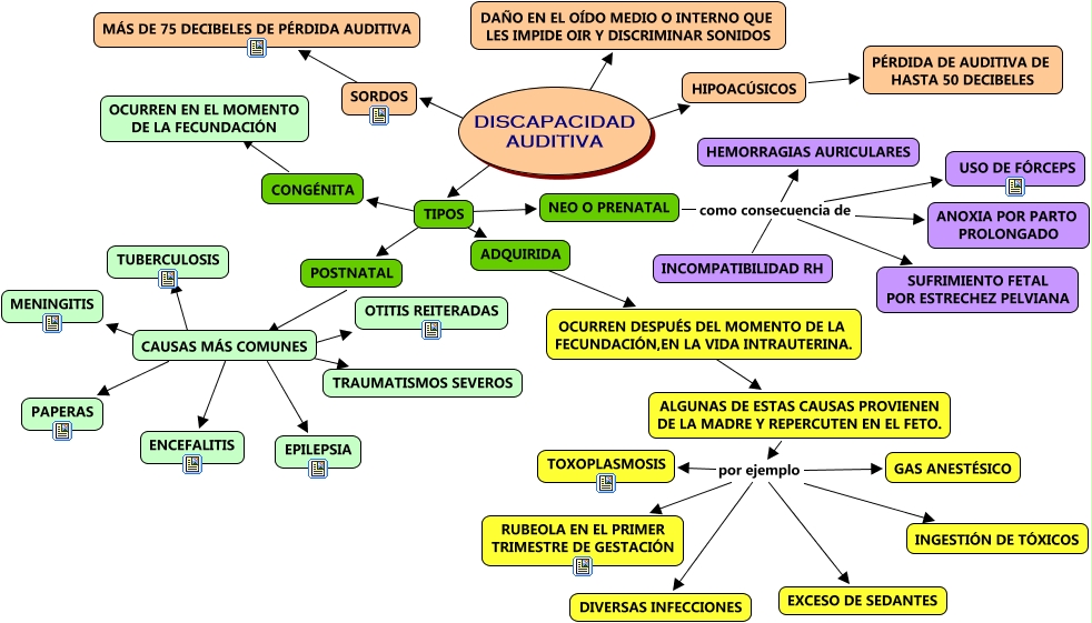 Este Cmap, tiene información relacionada con: sordos e hipoacúsicos, TIPOS ???? ADQUIRIDA, DISCAPACIDAD AUDITIVA ???? HIPOACÚSICOS, DISCAPACIDAD AUDITIVA ???? SORDOS, NEO O PRENATAL como consecuencia de INCOMPATIBILIDAD RH, HIPOACÚSICOS ???? PÉRDIDA DE AUDITIVA DE HASTA 50 DECIBELES, OCURREN DESPUÉS DEL MOMENTO DE LA FECUNDACIÓN,EN LA VIDA INTRAUTERINA. ???? ALGUNAS DE ESTAS CAUSAS PROVIENEN DE LA MADRE Y REPERCUTEN EN EL FETO., SORDOS ???? MÁS DE 75 DECIBELES DE PÉRDIDA AUDITIVA, CONGÉNITA ???? OCURREN EN EL MOMENTO DE LA FECUNDACIÓN, ALGUNAS DE ESTAS CAUSAS PROVIENEN DE LA MADRE Y REPERCUTEN EN EL FETO. por ejemplo INGESTIÓN DE TÓXICOS, CAUSAS MÁS COMUNES ???? MENINGITIS, POSTNATAL ???? CAUSAS MÁS COMUNES, ADQUIRIDA ???? OCURREN DESPUÉS DEL MOMENTO DE LA FECUNDACIÓN,EN LA VIDA INTRAUTERINA., NEO O PRENATAL como consecuencia de SUFRIMIENTO FETAL POR ESTRECHEZ PELVIANA, CAUSAS MÁS COMUNES ???? EPILEPSIA, CAUSAS MÁS COMUNES ???? OTITIS REITERADAS, NEO O PRENATAL como consecuencia de USO DE FÓRCEPS, CAUSAS MÁS COMUNES ???? TUBERCULOSIS, CAUSAS MÁS COMUNES ???? ENCEFALITIS, TIPOS ???? NEO O PRENATAL, TIPOS ???? POSTNATAL