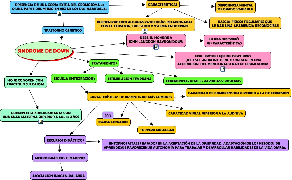 Este Cmap, tiene información relacionada con: presDown, TRATAMIENTOS ???? ESTIMULACIÓN TEMPRANA, CARACTERÍSTICAS ???? PUEDEN PADECER ALGUNAS PATOLOGÍAS RELACIONADAS CON EL CORAZÓN, DIGESTIÓN Y SISTEMA ENDOCRINO, RECURSOS DIDÁCTICOS ???? MEDIOS GRÁFICOS E IMÁGENES, CARACTERÍSTICAS DE APRENDIZAJE MÁS COMUNES ???? TORPEZA MUSCULAR, SINDROME DE DOWN ???? NO SE CONOCEN CON EXACTITUD SUS CAUSAS, SINDROME DE DOWN ???? 1958: JERÔME LEJEUNE DESCUBRIÓ QUE ESTE SINDROME TIENE SU ORIGEN EN UNA ALTERACIÓN DEL MENCIONADO PAR DE CROMOSOMAS, SINDROME DE DOWN ???? TRATAMIENTOS, CARACTERÍSTICAS ???? RASGOS FÍSICOS PECULIARES QUE LE DAN UNA APARIENCIA RECONOCIBLE, TRATAMIENTOS ???? EXPERIENCIAS VITALES VARIADAS Y POSITIVAS, SINDROME DE DOWN ???? TRASTORNO GENÉTICO, DEBE SU NOMBRE A JOHN LANGDON HAYDON DOWN ???? EN 1866 DESCRIBIÓ SUS CARACTERÍSTICAS, TRATAMIENTOS ???? ESCUELA (INTEGRACIÓN), CARACTERÍSTICAS DE APRENDIZAJE MÁS COMUNES ???? RECURSOS DIDÁCTICOS, NO SE CONOCEN CON EXACTITUD SUS CAUSAS ???? PUEDEN ESTAR RELACIONADAS CON UNA EDAD MATERNA SUPERIOR A LOS 35 AÑOS, PRESENCIA DE UNA COPIA EXTRA DEL CROMOSOMA 21 O UNA PARTE DEL MISMO EN VEZ DE LOS DOS HABITUALES ???? CARACTERÍSTICAS, CARACTERÍSTICAS DE APRENDIZAJE MÁS COMUNES ???? CAPACIDAD DE COMPRENSIÓN SUPERIOR A LA DE EXPRESIÓN, CARACTERÍSTICAS DE APRENDIZAJE MÁS COMUNES ???? CAPACIDAD VISUAL SUPERIOR A LA AUDITIVA, TRASTORNO GENÉTICO ???? PRESENCIA DE UNA COPIA EXTRA DEL CROMOSOMA 21 O UNA PARTE DEL MISMO EN VEZ DE LOS DOS HABITUALES, CARACTERÍSTICAS ???? DEFICIENCIA MENTAL DE GRADO VARIABLE, RECURSOS DIDÁCTICOS ???? ENTORNOS VITALES BASADOS EN LA ACEPTACIÓN DE LA DIVERSIDAD, ADAPTACIÓN DE LOS MÉTODOS DE APRENDIZAJE FAVORECEN SU AUTONOMÍA PARA TRABAJAR Y DESARROLLAR HABILIDADES DE LA VIDA DIARIA.