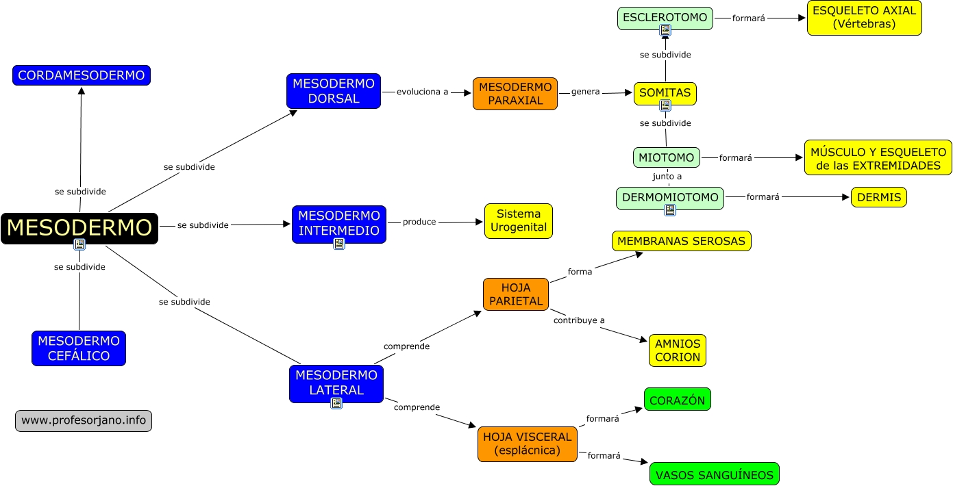 Este Cmap, tiene información relacionada con: EVOLUCIÓN MESODERMO, MESODERMO se subdivide MESODERMO DORSAL, SOMITAS se subdivide MIOTOMO, MESODERMO INTERMEDIO produce Sistema Urogenital, MESODERMO se subdivide MESODERMO CEFÁLICO, DERMOMIOTOMO formará DERMIS, MESODERMO se subdivide MESODERMO LATERAL, DERMOMIOTOMO junto a MIOTOMO, HOJA VISCERAL (esplácnica) formará CORAZÓN, MIOTOMO formará MÚSCULO Y ESQUELETO de las EXTREMIDADES, HOJA PARIETAL forma MEMBRANAS SEROSAS, MESODERMO PARAXIAL genera SOMITAS, MESODERMO LATERAL comprende HOJA VISCERAL (esplácnica), ESCLEROTOMO formará ESQUELETO AXIAL (Vértebras), SOMITAS se subdivide ESCLEROTOMO, HOJA VISCERAL (esplácnica) formará VASOS SANGUÍNEOS, MESODERMO se subdivide MESODERMO INTERMEDIO, MESODERMO se subdivide CORDAMESODERMO, MESODERMO DORSAL evoluciona a MESODERMO PARAXIAL, MESODERMO LATERAL comprende HOJA PARIETAL, HOJA PARIETAL contribuye a AMNIOS CORION