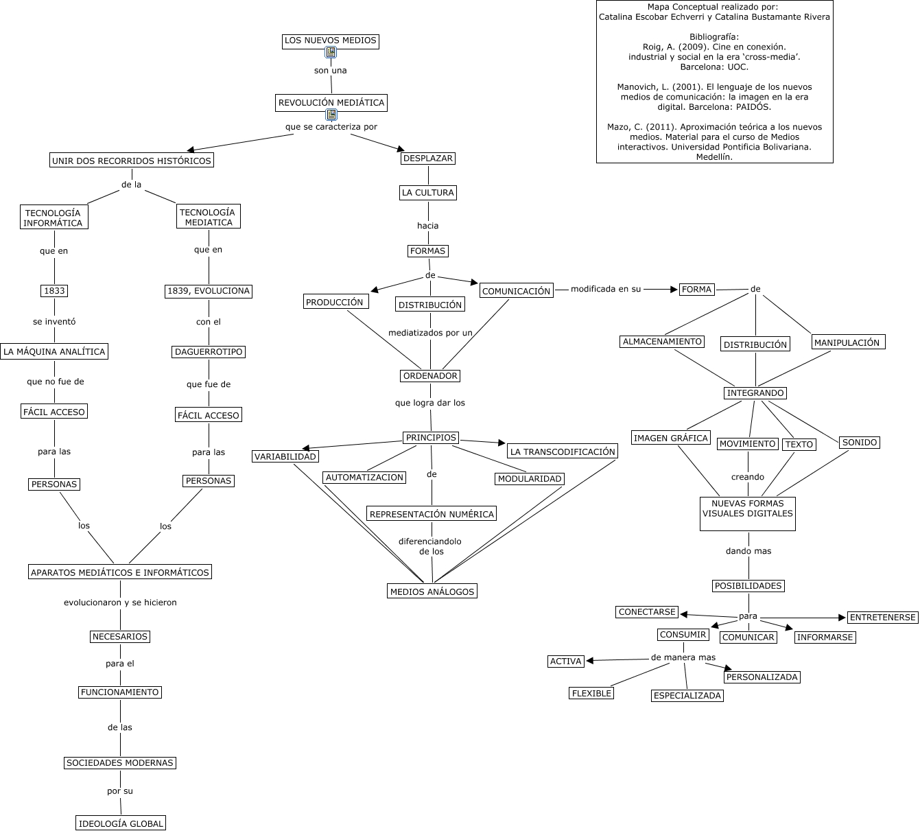 Este Cmap, tiene información relacionada con: NUEVOS MEDIOS.cmap, CONSUMIR de manera mas ACTIVA, LA TRANSCODIFICACIÓN MEDIOS ANÁLOGOS, 1839, EVOLUCIONA con el DAGUERROTIPO, LOS NUEVOS MEDIOS son una REVOLUCIÓN MEDIÁTICA, FORMAS de PRODUCCIÓN, PRODUCCIÓN ORDENADOR, POSIBILIDADES para COMUNICAR, FORMA de MANIPULACIÓN, INTEGRANDO TEXTO, POSIBILIDADES para ENTRETENERSE, COMUNICACIÓN ORDENADOR, REVOLUCIÓN MEDIÁTICA que se caracteriza por UNIR DOS RECORRIDOS HISTÓRICOS, CONSUMIR de manera mas PERSONALIZADA, NECESARIOS para el FUNCIONAMIENTO, PRINCIPIOS de REPRESENTACIÓN NUMÉRICA, CONSUMIR de manera mas ESPECIALIZADA, ALMACENAMIENTO INTEGRANDO, FORMA de DISTRIBUCIÓN, UNIR DOS RECORRIDOS HISTÓRICOS de la TECNOLOGÍA MEDIATICA, FÁCIL ACCESO para las PERSONAS