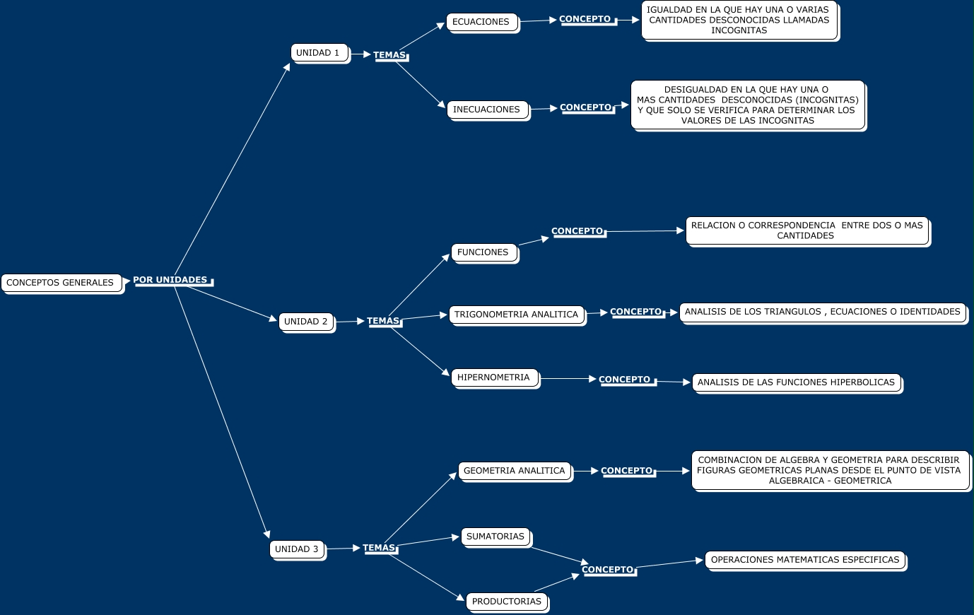 Este Cmap, tiene información relacionada con: CONCEPTOS GENERALES, PRODUCTORIAS CONCEPTO OPERACIONES MATEMATICAS ESPECIFICAS, UNIDAD 1 TEMAS INECUACIONES, HIPERNOMETRIA CONCEPTO ANALISIS DE LAS FUNCIONES HIPERBOLICAS, CONCEPTOS GENERALES POR UNIDADES UNIDAD 3, CONCEPTOS GENERALES POR UNIDADES UNIDAD 1, UNIDAD 3 TEMAS GEOMETRIA ANALITICA, CONCEPTOS GENERALES POR UNIDADES UNIDAD 2, ECUACIONES CONCEPTO IGUALDAD EN LA QUE HAY UNA O VARIAS CANTIDADES DESCONOCIDAS LLAMADAS INCOGNITAS, SUMATORIAS CONCEPTO OPERACIONES MATEMATICAS ESPECIFICAS, UNIDAD 2 TEMAS HIPERNOMETRIA, UNIDAD 3 TEMAS SUMATORIAS, UNIDAD 2 TEMAS FUNCIONES, TRIGONOMETRIA ANALITICA CONCEPTO ANALISIS DE LOS TRIANGULOS , ECUACIONES O IDENTIDADES, UNIDAD 3 TEMAS PRODUCTORIAS, UNIDAD 1 TEMAS ECUACIONES, FUNCIONES CONCEPTO RELACION O CORRESPONDENCIA ENTRE DOS O MAS CANTIDADES, UNIDAD 2 TEMAS TRIGONOMETRIA ANALITICA, INECUACIONES CONCEPTO DESIGUALDAD EN LA QUE HAY UNA O MAS CANTIDADES DESCONOCIDAS (INCOGNITAS) Y QUE SOLO SE VERIFICA PARA DETERMINAR LOS VALORES DE LAS INCOGNITAS, GEOMETRIA ANALITICA CONCEPTO COMBINACION DE ALGEBRA Y GEOMETRIA PARA DESCRIBIR FIGURAS GEOMETRICAS PLANAS DESDE EL PUNTO DE VISTA ALGEBRAICA - GEOMETRICA