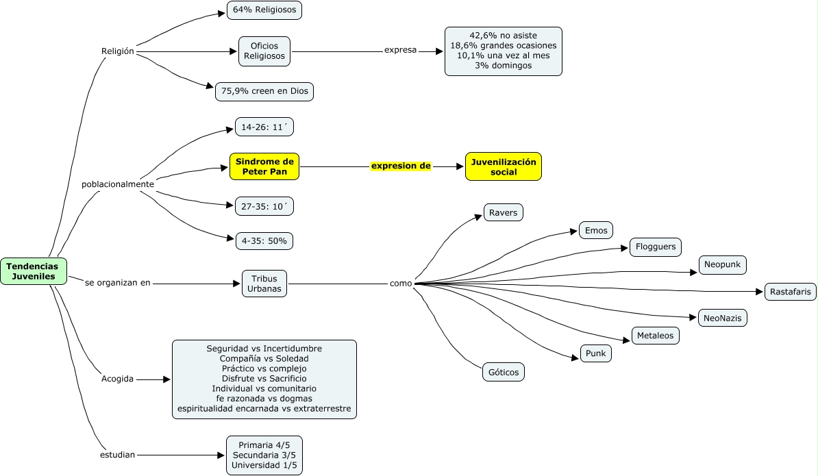 Este Cmap, tiene información relacionada con: jovenes, Tribus Urbanas como Metaleos, Tendencias Juveniles Religión 75,9% creen en Dios, Tendencias Juveniles Religión Oficios Religiosos, Tribus Urbanas como Flogguers, Tendencias Juveniles se organizan en Tribus Urbanas, Tribus Urbanas como Ravers, Tribus Urbanas como Rastafaris, Sindrome de Peter Pan expresion de Juvenilización social, Tribus Urbanas como Neopunk, Tendencias Juveniles poblacionalmente 27-35: 10´, Tendencias Juveniles poblacionalmente 4-35: 50%, Tribus Urbanas como Punk, Tendencias Juveniles Religión 64% Religiosos, Oficios Religiosos expresa 42,6% no asiste 18,6% grandes ocasiones 10,1% una vez al mes 3% domingos, Tendencias Juveniles Acogida Seguridad vs Incertidumbre Compañía vs Soledad Práctico vs complejo Disfrute vs Sacrificio Individual vs comunitario fe razonada vs dogmas espiritualidad encarnada vs extraterrestre, Tendencias Juveniles poblacionalmente 14-26: 11´, Tribus Urbanas como Góticos, Tendencias Juveniles poblacionalmente Sindrome de Peter Pan, Tribus Urbanas como Emos, Tribus Urbanas como NeoNazis