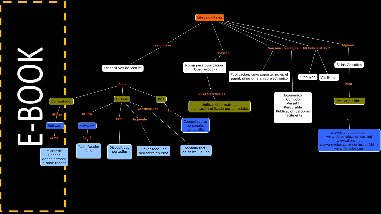 Este Cmap, tiene información relacionada con: librosdigitales, Unificar el formato de publicaciòn utilizado por editoriales Cuyo Objetivo es Noma para publicaciòn (Open e-book), Palm Reader Isilo Comò Software, pantalla tactil de cristal liquido Contiene una E-Book, Publicaciòn, cuyo soporte, no es el papel, si no un archivo electronico Son una Libros digitales, Sitios Gratuitos Para Descargar libros, Software Utiliza Computador, Descargar libros son www.todoebbook.com www.libros-electronicos.net www.elibro.net www.noveles.com/leer/gratis/.html www.librodot.com, Llevar toda una biblioteca en ellos Se puede E-Book, Via E-mail Se pude distibuir Libros digitales, Computador Como Dispositivos de lectura, Sitio web Se pude distibuir Libros digitales, Computadoras personales de bolsillo Son PDA, Software Utiliza E-Book, E-Book Como Dispositivos de lectura, Microosft Reader Adobe acrobat e-book reader Como Software, Dispositivos de lectura se utilizan Libros digitales, Dispositivos portatiles son E-Book, PDA Como Dispositivos de lectura, Noma para publicaciòn (Open e-book) Poseen Libros digitales