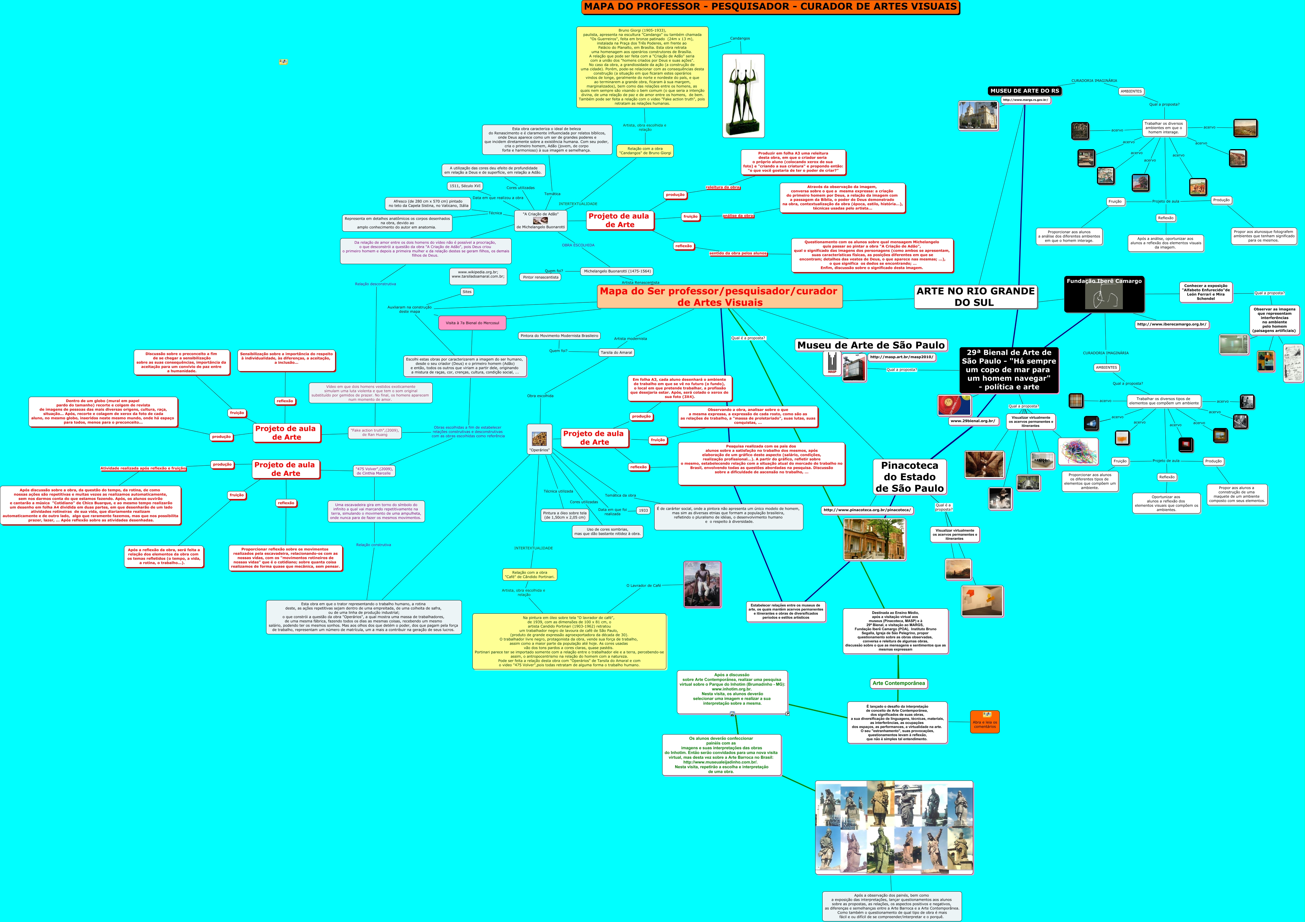 Esse mapa conceitual, produzido no IHMC CmapTools, tem a informação relacionada a: PROFESSOR-PESQUISADOR-CURADOR_Andrea, Mapa do Ser professor/pesquisador/curador de Artes Visuais Qual é a proposta? Destinada ao Ensino Médio, após a visitação virtual aos museus (Pinacoteca, MASP) e à 29ª Bienal, e visitação ao MARGS, Fundação Iberê Camargo (POA), Instituto Bruno Segalla, Igreja de São Pelegrino, propor questionamento sobre as obras observadas, conversa e releitura de algumas obras, discussão sobre o que as mensagens e sentimentos que as mesmas expressam, Trabalhar os diversos tipos de elementos que compõem um ambiente Projeto de aula Fruição, Mapa do Ser professor/pesquisador/curador de Artes Visuais Auxliaram na construção deste mapa Visita à 7a Bienal do Mercosul, fruição ???? Após a reflexão da obra, será feita a relação dos elementos da obra com os temas refletidos (o tempo, a vida, a rotina, o trabalho...)., O "Operários" INTERTEXTUALIDADE Relação com a obra "Café" de Cândido Portinari., "A Criação de Adão" de Michelangelo Buonarotti ???? Projeto de aula de Arte, Trabalhar os diversos ambientes em que o homem interage. acervo, Pinacoteca do Estado de São Paulo Qual é a proposta? ????, Mapa do Ser professor/pesquisador/curador de Artes Visuais Auxliaram na construção deste mapa Escolhi estas obras por caracterizarem a imagem do ser humano, desde o seu criador (Deus) e o primeiro homem (Adão) e então, todos os outros que viriam a partir dele, originando a mistura de raças, cor, crenças, cultura, condição social, ..., Bruno Giorgi (1905-1933), paulista, apresenta na escultura "Candango" ou também chamada "Os Guerreiros", feita em bronze patinado (24m x 13 m), instalada na Praça dos Três Poderes, em frente ao Palácio do Planalto, em Brasília. Esta obra retrata uma homenagem aos operários construtores de Brasília. A relação que pode ser feita com a "Criação de Adão" seria com a união dos "homens criados por Deus e suas ações". No caso da obra, a grandiosidade da ação (a construção de uma cidade). Porém, pode-se relacionar com as consequências desta construção (a situação em que ficaram estes operários vindos de longe, geralmente do norte e nordeste do país, e que ao terminarem a grande obra, ficaram à sua margem, marginalizados), bem como das relações entre os homens, as quais nem sempre são visando o bem comum (o que seria a intenção divina, de uma relação de paz e de amor entre os homens, de bem. Também pode ser feita a relação com o video "Fake action truth", pois retratam as relações humanas. Candangos, Projeto de aula de Arte ???? fruição, reflexão ???? Projeto de aula de Arte, MUSEU DE ARTE DO RS CURADORIA IMAGINÁRIA AMBIENTES, 29ª Bienal de Arte de São Paulo - "Há sempre um copo de mar para um homem navegar" - política e arte ????, Observar as imagens que representam interferências no ambiente pelo homem (paisagens artificiais) ????, "A Criação de Adão" de Michelangelo Buonarotti Temática Esta obra caracteriza o ideal de beleza do Renascimento e é claramente influenciada por relatos bíblicos, onde Deus aparece como um ser de grandes poderes e que incidem diretamente sobre a existência humana. Com seu poder, cria o primeiro homem, Adão (jovem, de corpo forte e harmonioso) à sua imagem e semelhança., "A Criação de Adão" de Michelangelo Buonarotti Data em que realizou a obra 1511, Século XVI, O "Operários" Temática da obra É de carárter social, onde a pintora não apresenta um único modelo de homem, mas sim as diversas etnias que formam a população brasileira, refletindo o pluralismo de idéias, o desenvolvimento humano e o respeito à diversidade., Trabalhar os diversos ambientes em que o homem interage. acervo, ARTE NO RIO GRANDE DO SUL ???? MUSEU DE ARTE DO RS