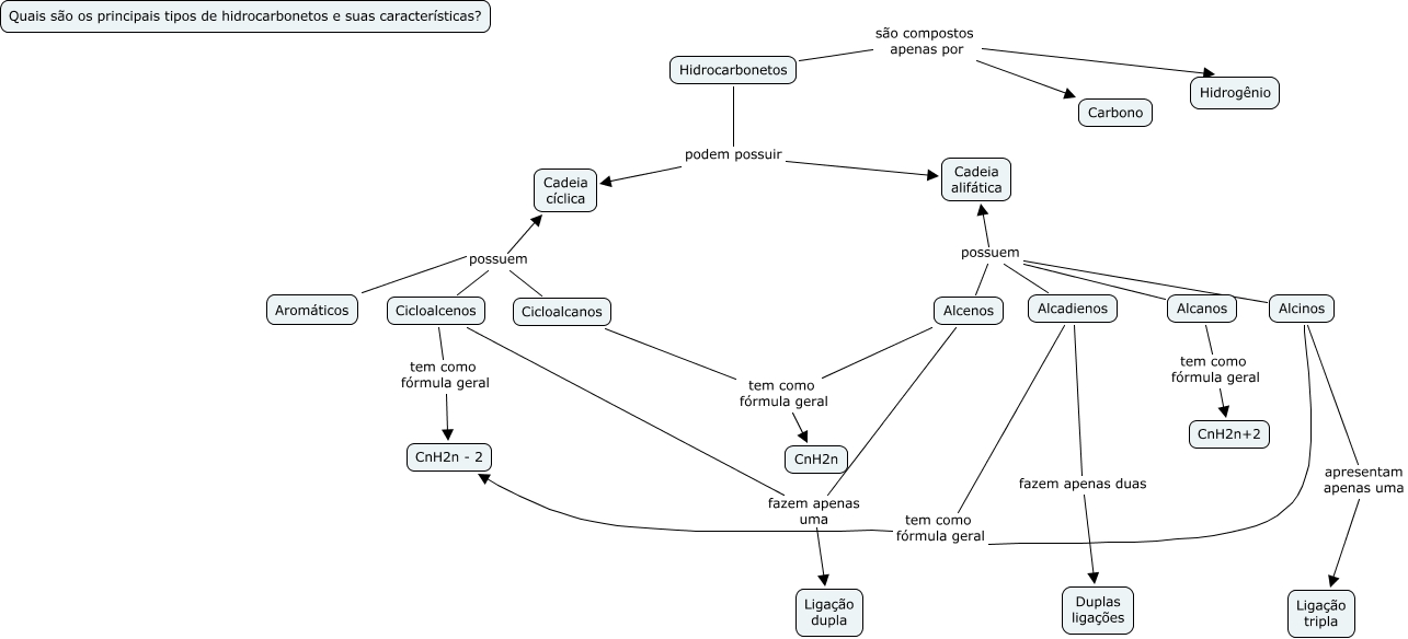 Esse mapa conceitual, produzido no IHMC CmapTools, tem a informação relacionada a: Hidrocatrbonetos, Alcenos tem como fórmula geral CnH2n, Alcadienos fazem apenas duas Duplas ligações, Alcenos fazem apenas uma Ligação dupla, Alcadienos tem como fórmula geral CnH2n - 2, Alcinos tem como fórmula geral CnH2n - 2, Cicloalcenos tem como fórmula geral CnH2n - 2, Aromáticos possuem Cadeia cíclica, Cicloalcanos tem como fórmula geral CnH2n, Alcanos possuem Cadeia alifática, Alcenos possuem Cadeia alifática, Cicloalcenos possuem Cadeia cíclica, Alcanos tem como fórmula geral CnH2n+2, Alcinos possuem Cadeia alifática, Hidrocarbonetos podem possuir Cadeia alifática, Hidrocarbonetos são compostos apenas por Carbono, Cicloalcanos possuem Cadeia cíclica, Hidrocarbonetos são compostos apenas por Hidrogênio, Cicloalcenos fazem apenas uma Ligação dupla, Hidrocarbonetos podem possuir Cadeia cíclica, Alcinos apresentam apenas uma Ligação tripla