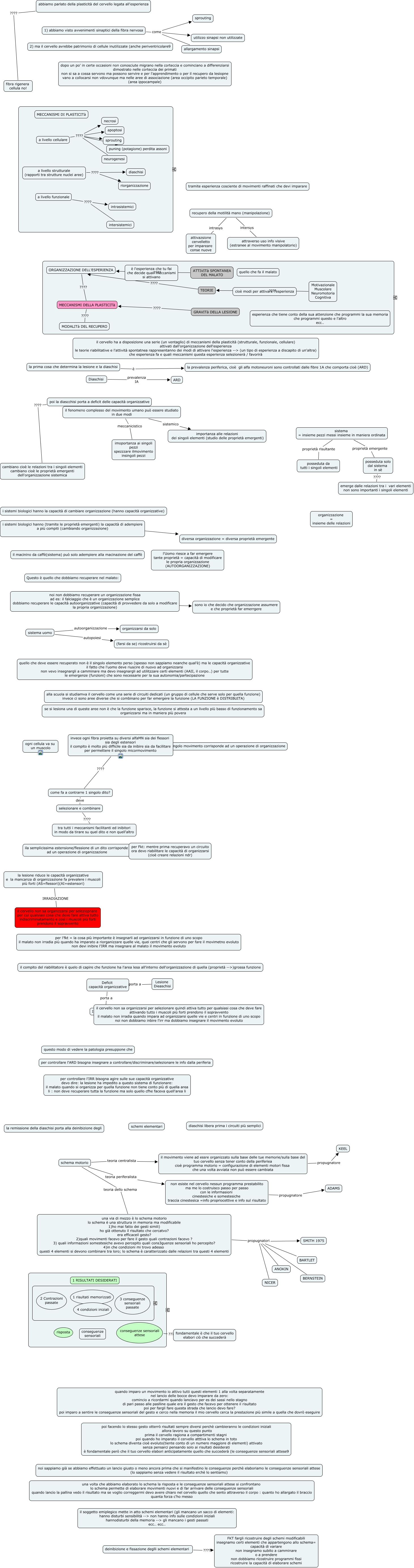 Questa Cmap, creata con IHMC CmapTools, contiene informazioni relative a: PERFETTI 221, una via di mezzo è lo schema motorio lo schema è una struttura in memoria ma modificabile 1)ho mai fatto dei gesti simili) ho già ottenuto il risultato che cercatvo? era efficaceil gesto? 2)quali movimenti facevo per fare il gesto quali contrazioni facevo ? 3) quali informazioni somestesiche avevo percepito quali cons3guenze sensoriali ho percepito? 4)in che condizioni mi trovo adesso questi 4 elementi si devono combinare tra loro; lo schema è caratterizzato dalle relazioni tra questi 4 elementi propugnatori SMITH 1975, i sistemi biologici hanno (tramite le proprietà emergenti) la capacità di adempiere a più compiti (cambiando organizzazione) ???? diversa organizzazione = diversa proprietà emergente, posseduta solo dal sistema in sè ???? emerge dalle relazioni tra i vari elementi non sono importanti i singoli elementi, a livello strutturale (rapporti tra strutture nuclei aree) ???? diaschisi, la prima cosa che determina la lesione e la diaschisi è la prevalenza periferica, cioè gli alfa motoneuroni sono controllati dalle fibre 1A che comporta cioè (ARD), il movimento viene ad essre organizzato sulla base delle tue memorie/sulla base del tuo cervello senza tener conto della periferiea cioè programma motorio = configuraziione di elementi motori fissa che una volta avviata non può essere cambiata propugnatore KEEL, Lesione Dieaschisi porta a Deficit capacità organizzative, una via di mezzo è lo schema motorio lo schema è una struttura in memoria ma modificabile 1)ho mai fatto dei gesti simili) ho già ottenuto il risultato che cercatvo? era efficaceil gesto? 2)quali movimenti facevo per fare il gesto quali contrazioni facevo ? 3) quali informazioni somestesiche avevo percepito quali cons3guenze sensoriali ho percepito? 4)in che condizioni mi trovo adesso questi 4 elementi si devono combinare tra loro; lo schema è caratterizzato dalle relazioni tra questi 4 elementi propugnatori NICER, invece ogni fibra proietta su diversi alfaMN sia dei flessori sia degli estensori il compito è molto più difficile sia da inibire sia da facilitare per permettere il singolo micormovimento ???? come fa a contrarre 1 singolo dito?, il fenomeno complesso del movimento umano può essere studiato in due modi meccanicistico imoportanza ai singoli pezzi spezzzare ilmovimento insingoli pezzi, noi non dobbiamo recuperare un organizzazione fissa ad es: il falciaggio che è un organizzazione semplice dobbiamo recuperare le capacità autoorganizzative (capacità di provvedere da solo a modificare la propria organizzazione) ???? sono io che decido che organizzazione assumere e che proprietà far emerrgere, abbiamo parlato della plasticità del cervello legata all'esperienza ???? fibra rigenera cellula no!, 1) abbiamo visto avvenimenti sinaptici della fibra nervosa come sprouting, a livello cellulare ???? sprouting, a livello strutturale (rapporti tra strutture nuclei aree) ???? riorganizzazione, una via di mezzo è lo schema motorio lo schema è una struttura in memoria ma modificabile 1)ho mai fatto dei gesti simili) ho già ottenuto il risultato che cercatvo? era efficaceil gesto? 2)quali movimenti facevo per fare il gesto quali contrazioni facevo ? 3) quali informazioni somestesiche avevo percepito quali cons3guenze sensoriali ho percepito? 4)in che condizioni mi trovo adesso questi 4 elementi si devono combinare tra loro; lo schema è caratterizzato dalle relazioni tra questi 4 elementi propugnatori BARTLET, a livello cellulare ???? apoptosi, GRAVITà DELLA LESIONE ???? MECCANISMI DELLA PLASTICITà, sistema uomo autopoiesi (farsi da se) ricostruirsi da sè, deinibizione e fissazione deglli schemi elementari ???? FKT fargli ricostruire degli schemi modificabili insegnamo certi elementi che appartengono allo schema= capacità di variare non insegnamo subito a camminare o a prendere non dobbiamo ricostruire programmi fissi ricostruire la capacità di elaborare schemi