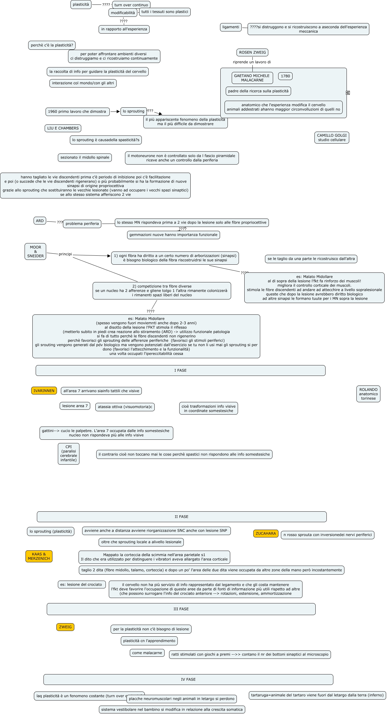 Questa Cmap, creata con IHMC CmapTools, contiene informazioni relative a: PERFETTI 212, MOOR & SNEIDER principi 2) competizione tra fibre diverse se un nucleo ha 2 afferenze e gliene tolgo 1 l'altra rimanente colonizzerà i rimanenti spazi liberi del nucleo, lo sprouting ???? il più appariscente fenomeno della plasticità ma il più difficile da dimostrare, ROSEN ZWEIG riprende un lavoro di GAETANO MICHELE MALACARNE, problema periferia ???? lo stesso MN rispondeva prima a 2 vie dopo la lesione solo alle fibre propriocettive, 2) competizione tra fibre diverse se un nucleo ha 2 afferenze e gliene tolgo 1 l'altra rimanente colonizzerà i rimanenti spazi liberi del nucleo ???? es: Malato Midollare (spesso vengono fuori moviemnti anche dopo 2-3 anni) al disotto della lesione l'FKT stimola il riflesso (metterlo subito in piedi crea reazione allo stiramento (ARD) -> utilizzo funzionale patologia si fa di tutto perchè le fibre discendenti non rigenerino perchè favorisci gli sprouting delle afferenze periferiche (favorisci gli stimoli periferici) gli srouting vengono generati dal pdv biologico ma vengono potenziati dall'esercizio se tu non li usi mai gli sprouting si per dono (favorisci l'attecchimento e la funzionalità) una volta occupati l'ipereccitabilità cessa, modificabilità ???? in rapporto all'esperienza, ligamenti ???? ????si distruggono e si ricostruiscono a aseconda dell'esperienza meccanica, 1960 primo lavoro che dimostra ???? lo sprouting, lo stesso MN rispondeva prima a 2 vie dopo la lesione solo alle fibre propriocettive ???? gemmazioni nuove hanno importanza funzionale, plasticità ???? turn over continuo, modificabilità ???? tutti i tessuti sono plastici, 1) ogni fibra ha diritto a un certo numero di arborizzazioni (sinapsi) è bisogno biologico della fibra riscostruidrsi le sue sinapsi ???? es: Malato Midollare al di sopra della lesione l'fkt fa rinforzo dei muscoli! migliora il controllo corticale dei muscoli. stimola le fibre discendenti ad andare ad attecchire a livello sopralesionale queste che dopo la lesione avrebbero diritto biologico ad altre sinapsi le formano tuute per i MN sopra la lesione, ARD ???? problema periferia, MOOR & SNEIDER principi 1) ogni fibra ha diritto a un certo numero di arborizzazioni (sinapsi) è bisogno biologico della fibra riscostruidrsi le sue sinapsi