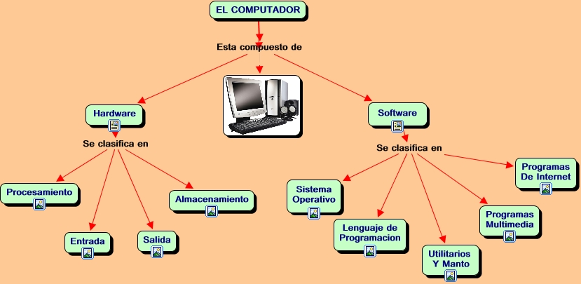 Este Cmap, tiene información relacionada con: El Computador, Hardware Se clasifica en Almacenamiento, Hardware Se clasifica en Entrada, Software Se clasifica en Programas Multimedia, EL COMPUTADOR Esta compuesto de Software, Software Se clasifica en Lenguaje de Programacion, Software Se clasifica en Utilitarios Y Manto, Software Se clasifica en Programas De Internet, Hardware Se clasifica en Salida, EL COMPUTADOR Esta compuesto de Hardware, Hardware Se clasifica en Procesamiento, Software Se clasifica en Sistema Operativo, EL COMPUTADOR