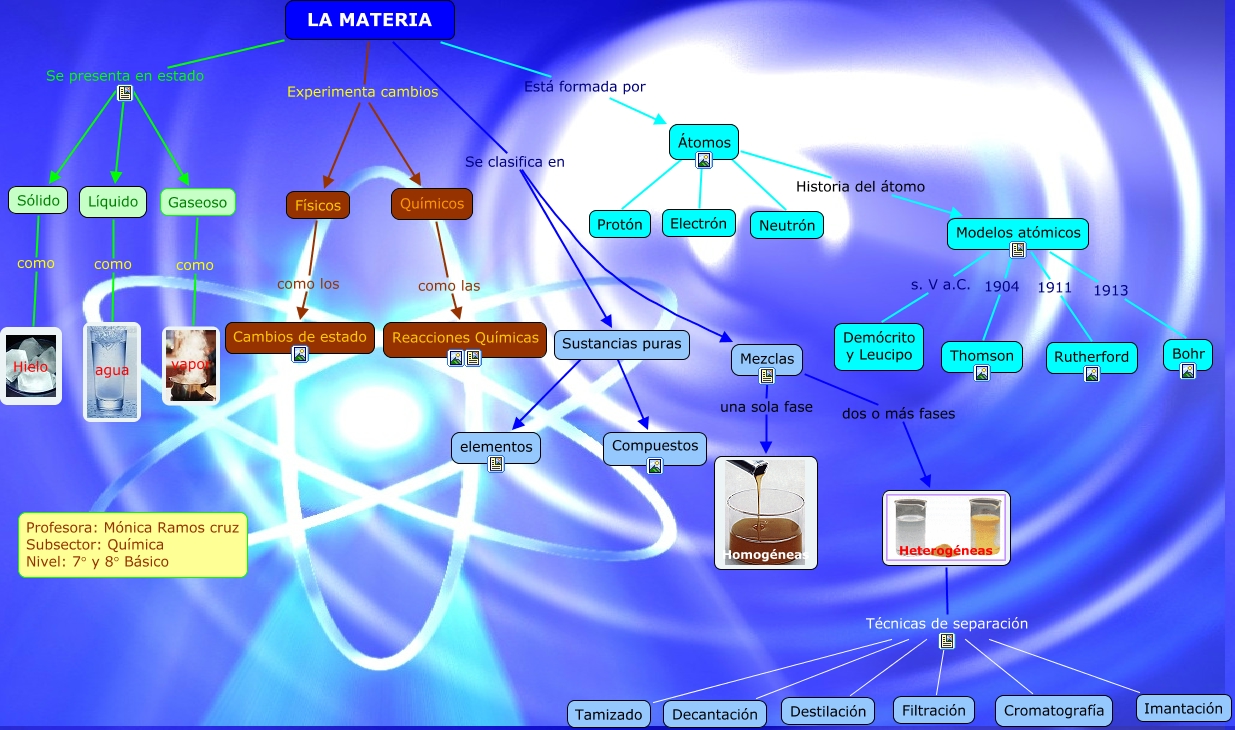Este Cmap, tiene información relacionada con: Estructura y comportamiento de la materia2, Heterogéneas Técnicas de separación Cromatografía, Físicos como los Cambios de estado, Modelos atómicos s. V a.C. Demócrito y Leucipo, Átomos ???? Protón, Sustancias puras ???? Compuestos, Sustancias puras ???? elementos, LA MATERIA Se clasifica en Mezclas, Átomos ???? Neutrón, Modelos atómicos 1913 Bohr, Sólido como Hielo, LA MATERIA Se clasifica en Sustancias puras, LA MATERIA Experimenta cambios Físicos, Químicos como las Reacciones Químicas, Líquido como agua, Heterogéneas Técnicas de separación Filtración, Mezclas dos o más fases Heterogéneas, Heterogéneas Técnicas de separación Destilación, LA MATERIA Está formada por Átomos, LA MATERIA Experimenta cambios Químicos, Heterogéneas Técnicas de separación Imantación