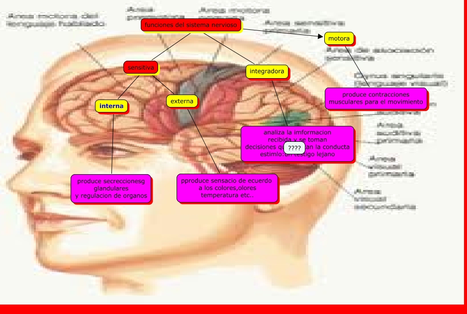 Este Cmap, tiene información relacionada con: sistema nervioso, sensitiva ???? interna, funciones del sistema nervioso ???? sensitiva, funciones del sistema nervioso ???? motora, interna ???? produce secreccionesg glandulares y regulacion de organos, funciones del sistema nervioso ???? integradora, externa ???? pproduce sensacio de ecuerdo a los colores,olores temperatura etc.., motora ???? produce contracciones musculares para el movimiento, sensitiva ???? externa, integradora ???? ????