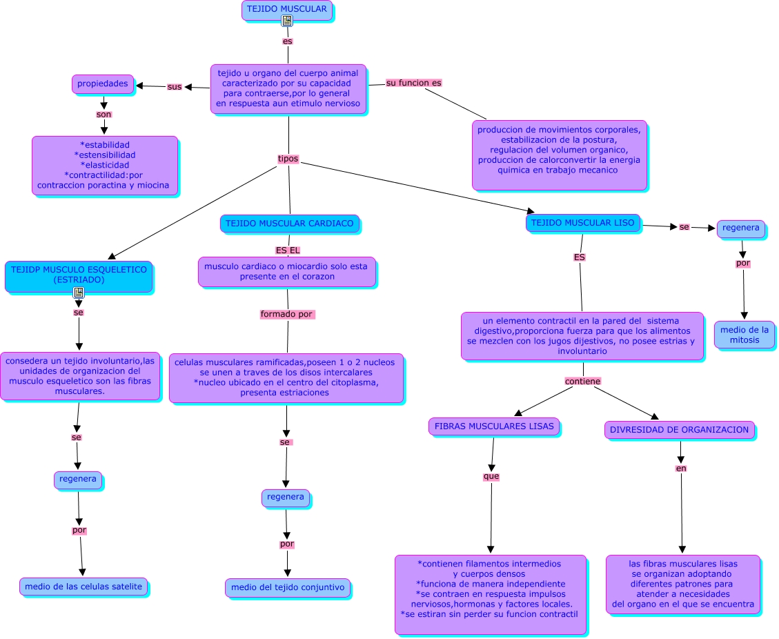 Este Cmap, tiene información relacionada con: Sistema Muscular, regenera por medio del tejido conjuntivo, regenera por medio de las celulas satelite, TEJIDO MUSCULAR LISO se regenera, celulas musculares ramificadas,poseen 1 o 2 nucleos se unen a traves de los disos intercalares *nucleo ubicado en el centro del citoplasma, presenta estriaciones se regenera, TEJIDO MUSCULAR CARDIACO ES EL musculo cardiaco o miocardio solo esta presente en el corazon, propiedades son *estabilidad *estensibilidad *elasticidad *contractilidad:por contraccion poractina y miocina, regenera por medio de la mitosis, musculo cardiaco o miocardio solo esta presente en el corazon formado por celulas musculares ramificadas,poseen 1 o 2 nucleos se unen a traves de los disos intercalares *nucleo ubicado en el centro del citoplasma, presenta estriaciones, tejido u organo del cuerpo animal caracterizado por su capacidad para contraerse,por lo general en respuesta aun etimulo nervioso tipos TEJIDO MUSCULAR CARDIACO, tejido u organo del cuerpo animal caracterizado por su capacidad para contraerse,por lo general en respuesta aun etimulo nervioso tipos TEJIDP MUSCULO ESQUELETICO (ESTRIADO), FIBRAS MUSCULARES LISAS que *contienen filamentos intermedios y cuerpos densos *funciona de manera independiente *se contraen en respuesta impulsos nerviosos,hormonas y factores locales. *se estiran sin perder su funcion contractil, tejido u organo del cuerpo animal caracterizado por su capacidad para contraerse,por lo general en respuesta aun etimulo nervioso sus propiedades, consedera un tejido involuntario,las unidades de organizacion del musculo esqueletico son las fibras musculares. se regenera, TEJIDO MUSCULAR es tejido u organo del cuerpo animal caracterizado por su capacidad para contraerse,por lo general en respuesta aun etimulo nervioso, tejido u organo del cuerpo animal caracterizado por su capacidad para contraerse,por lo general en respuesta aun etimulo nervioso su funcion es produccion de movimientos corporales, estabilizacion de la postura, regulacion del volumen organico, produccion de calorconvertir la energia quimica en trabajo mecanico, un elemento contractil en la pared del sistema digestivo,proporciona fuerza para que los alimentos se mezclen con los jugos dijestivos, no posee estrias y involuntario contiene FIBRAS MUSCULARES LISAS, DIVRESIDAD DE ORGANIZACION en las fibras musculares lisas se organizan adoptando diferentes patrones para atender a necesidades del organo en el que se encuentra, TEJIDO MUSCULAR LISO ES un elemento contractil en la pared del sistema digestivo,proporciona fuerza para que los alimentos se mezclen con los jugos dijestivos, no posee estrias y involuntario, un elemento contractil en la pared del sistema digestivo,proporciona fuerza para que los alimentos se mezclen con los jugos dijestivos, no posee estrias y involuntario contiene DIVRESIDAD DE ORGANIZACION, TEJIDP MUSCULO ESQUELETICO (ESTRIADO) se consedera un tejido involuntario,las unidades de organizacion del musculo esqueletico son las fibras musculares.