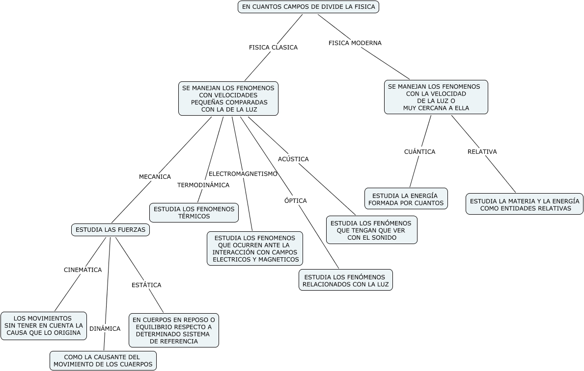 Este Cmap, tiene información relacionada con: LA FISICA, ESTUDIA LAS FUERZAS CINEMATICA LOS MOVIMIENTOS SIN TENER EN CUENTA LA CAUSA QUE LO ORIGINA, SE MANEJAN LOS FENOMENOS CON VELOCIDADES PEQUEÑAS COMPARADAS CON LA DE LA LUZ ACÚSTICA ESTUDIA LOS FENÓMENOS QUE TENGAN QUE VER CON EL SONIDO, SE MANEJAN LOS FENOMENOS CON VELOCIDADES PEQUEÑAS COMPARADAS CON LA DE LA LUZ ELECTROMAGNETISMO ESTUDIA LOS FENOMENOS QUE OCURREN ANTE LA INTERACCIÓN CON CAMPOS ELECTRICOS Y MAGNETICOS, EN CUANTOS CAMPOS DE DIVIDE LA FISICA FISICA MODERNA SE MANEJAN LOS FENOMENOS CON LA VELOCIDAD DE LA LUZ O MUY CERCANA A ELLA, ESTUDIA LAS FUERZAS ESTÁTICA EN CUERPOS EN REPOSO O EQUILIBRIO RESPECTO A DETERMINADO SISTEMA DE REFERENCIA, SE MANEJAN LOS FENOMENOS CON VELOCIDADES PEQUEÑAS COMPARADAS CON LA DE LA LUZ TERMODINÁMICA ESTUDIA LOS FENOMENOS TÉRMICOS, EN CUANTOS CAMPOS DE DIVIDE LA FISICA FISICA CLASICA SE MANEJAN LOS FENOMENOS CON VELOCIDADES PEQUEÑAS COMPARADAS CON LA DE LA LUZ, ESTUDIA LAS FUERZAS DINÁMICA COMO LA CAUSANTE DEL MOVIMIENTO DE LOS CUAERPOS, SE MANEJAN LOS FENOMENOS CON VELOCIDADES PEQUEÑAS COMPARADAS CON LA DE LA LUZ MECANICA ESTUDIA LAS FUERZAS, SE MANEJAN LOS FENOMENOS CON LA VELOCIDAD DE LA LUZ O MUY CERCANA A ELLA CUÁNTICA ESTUDIA LA ENERGÍA FORMADA POR CUANTOS, SE MANEJAN LOS FENOMENOS CON LA VELOCIDAD DE LA LUZ O MUY CERCANA A ELLA RELATIVA ESTUDIA LA MATERIA Y LA ENERGÍA COMO ENTIDADES RELATIVAS, SE MANEJAN LOS FENOMENOS CON VELOCIDADES PEQUEÑAS COMPARADAS CON LA DE LA LUZ ÓPTICA ESTUDIA LOS FENÓMENOS RELACIONADOS CON LA LUZ