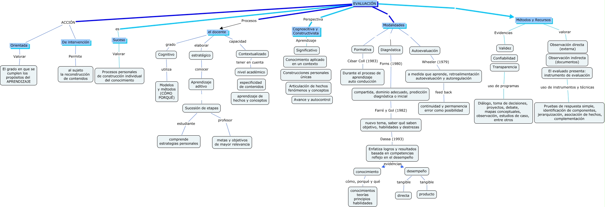 Este Cmap, tiene información relacionada con: EVALUACIÓN, Métodos y Recursos Evidencias Validez, EVALUACIÓN ACCIÓN De intervención, Sucesión de etapas estudiante comprende estrategias personales, Diagnóstica Forns (1980) compartida, dominio adecuado, predicción diagnóstica o inicial, Modalidades Diagnóstica, desempeño tangible directa, El evaluado presenta: instrumento de evaluación uso de instrumentos y técnicas Pruebas de respuesta simple, identificación de componentes, jerarquización, asociación de hechos, complementación, Contextualizado tener en cuenta nivel académico, Aprendizaje aditivo Sucesión de etapas, desempeño tangible producto, EVALUACIÓN ACCIÓN Orientada, a medida que aprende, retroalimentación autoevaluación y autoregulación feed back continuidad y permanencia error como posibilidad, Sucesión de etapas profesor metas y objetivos de mayor relevancia, EVALUACIÓN Procesos el docente, Suceso Valorar Procesos personales de construcción individual del conocimiento, Enfatiza logros y resultados basada en competencias reflejo en el desempeño evidencias desempeño, el docente capacidad Contextualizado, compartida, dominio adecuado, predicción diagnóstica o inicial Farré y Gol (1982) nuevo tema, saber qué saben objetivo, habilidades y destrezas, Enfatiza logros y resultados basada en competencias reflejo en el desempeño evidencias conocimiento, EVALUACIÓN Perspectiva Cognoscitiva y Constructivista