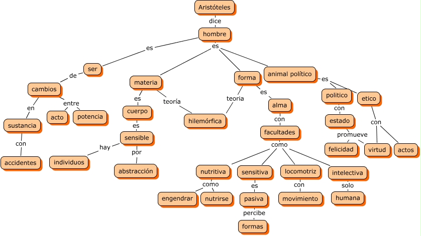 Este Cmap, tiene información relacionada con: ARISTÓTELES ANTROPOLOGÍA, materia es cuerpo, forma teoria hilemórfica, sustancia con accidentes, cambios en sustancia, forma es alma, nutritiva como nutrirse, alma con facultades, sensible hay individuos, estado promueve virtud, materia teoría hilemórfica, animal político es politico, facultades como nutritiva, sensible por abstracción, nutritiva como engendrar, pasiva percibe formas, cambios entre acto, hombre es forma, cuerpo es sensible, cambios entre potencia, hombre es ser