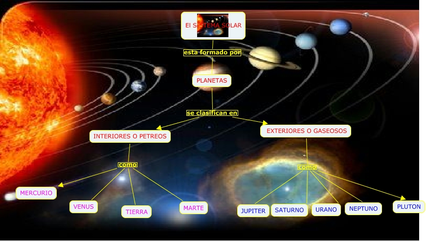 Este Cmap, tiene información relacionada con: PLANETA, EXTERIORES O GASEOSOS como PLUTON, PLANETAS se clasifican en EXTERIORES O GASEOSOS, PLANETAS se clasifican en INTERIORES O PETREOS, INTERIORES O PETREOS como TIERRA, INTERIORES O PETREOS como VENUS, El SISTEMA SOLAR esta formado por PLANETAS, EXTERIORES O GASEOSOS como URANO, EXTERIORES O GASEOSOS como SATURNO, EXTERIORES O GASEOSOS como JUPITER, INTERIORES O PETREOS como MERCURIO, EXTERIORES O GASEOSOS como NEPTUNO, INTERIORES O PETREOS como MARTE