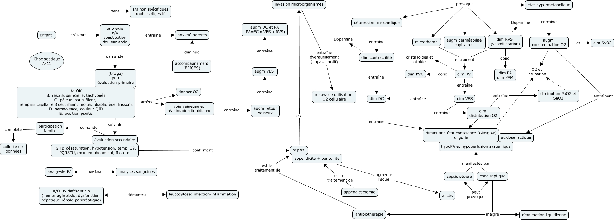 Cette carte de concepts créée avec IHMC CmapTools traite de: Choc septiqueA11, accompagnement (EPICES) diminue anxiété parents, invasion microorganismes provoque microthombi, dim contractilité entraîne dim DC, FGHI: désaturation, hypotension, temp. 39, PQRSTU, examen abdominal, Rx, etc confirment sepsis, dim RV donc dim PVC, dim distribution O2 ???? diminution état conscience (Glasgow) oligurie, FGHI: désaturation, hypotension, temp. 39, PQRSTU, examen abdominal, Rx, etc amène analyses sanguines, appendicectomie est le traitement de appendicite + péritonite, dim RV entraîne dim VES, analyses sanguines démontre leucocytose: infection/inflammation, augm VES entraîne augm DC et PA (PA=FC x VES x RVS), dépression myocardique entraîne dim contractilité, anorexie n/v constipation douleur abdo demande (triage) puis évaluation primaire, anorexie n/v constipation douleur abdo entraîne anxiété parents, augm perméabilité capillaires entraînent dim RV, anorexie n/v constipation douleur abdo sont s/s non spécifiques troubles digestifs, dim DC entraîne diminution état conscience (Glasgow) oligurie, choc septique malgré antibiothérapie, A: OK B: resp superficielle, tachypnée C: pâleur, pouls filant, rempliss capillaire 3 sec, mains moites, diaphorèse, frissons D: somnolence, douleur QID E: position psoïtis amène voie veineuse et réanimation liquidienne, dim RVS (vasodilatation) ???? Dopamine