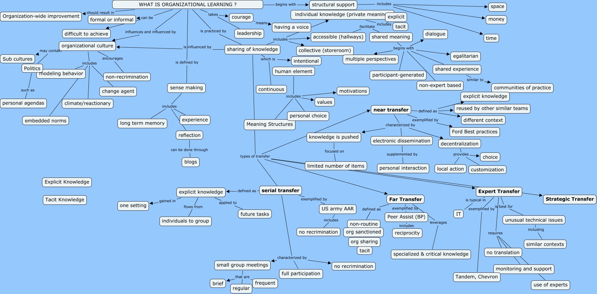 This Concept Map, created with IHMC CmapTools, has information related to: Organizational Learning 2011, organizational culture may contain Sub cultures, shared meaning begins with multiple perspectives, sharing of knowledge includes accessible (hallways), reflection can be done through blogs, shared meaning begins with egalitarian, accessible (hallways) facilitate shared meaning, human element includes values, sharing of knowledge which is continuous, near transfer characterized by knowledge is pushed, Far Transfer exemplified by Peer Assist (BP), decentralization provides customization, organizational culture includes change agent, sharing of knowledge includes collective (storeroom), sense making includes reflection, small group meetings that are frequent, shared experience similar to communities of practice, Meaning Structures includes values, shared meaning begins with shared experience, Far Transfer leverages specialized & critical knowledge, Expert Transfer exemplified by Tandem, Chevron