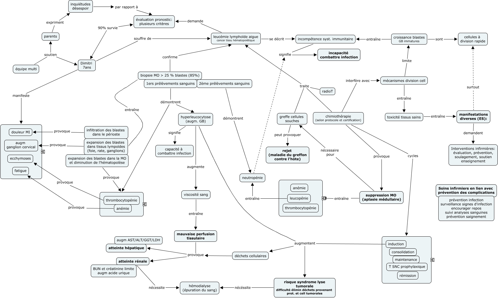 Cette carte de concepts créée avec IHMC CmapTools traite de: Leucémie A11, Dimitri 7ans souffre de leucémie lymphoïde aigue cancer tissu hématopoiétique, greffe cellules souches peut provoquer rejet (maladie du greffon contre l'hôte), chimiothérapie (selon protocole et certification) interfère avec mécanismes division cell, induction augmentent déchets cellulaires, chimiothérapie (selon protocole et certification) provoque suppression MO (aplasie médullaire), induction augmentent risque syndrome lyse tumorale difficulté élimin déchets provenant prot. et cell tumorales, leucopénie entraîne neutropénie, équipe multi soutien parents, 2ème prélèvements sanguins démontrent neutropénie, déchets cellulaires provoque atteinte rénale, risque syndrome lyse tumorale difficulté élimin déchets provenant prot. et cell tumorales nécéssite hémodialyse (épuration du sang), anémie provoque fatigue, mécanismes division cell entraîne toxicité tissus sains, manifestations diverses (ES): demandent Interventions infirmières: évaluation, prévention, soulagement, soutien enseignement, toxicité tissus sains entraîne manifestations diverses (ES):, leucémie lymphoïde aigue cancer tissu hématopoiétique se décrit incompétence syst. immunitaire, mécanismes division cell limite croissance blastes GB immatures, suppression MO (aplasie médullaire) nécessaire pour greffe cellules souches, Dimitri 7ans manifeste ????, chimiothérapie (selon protocole et certification) cycles ????