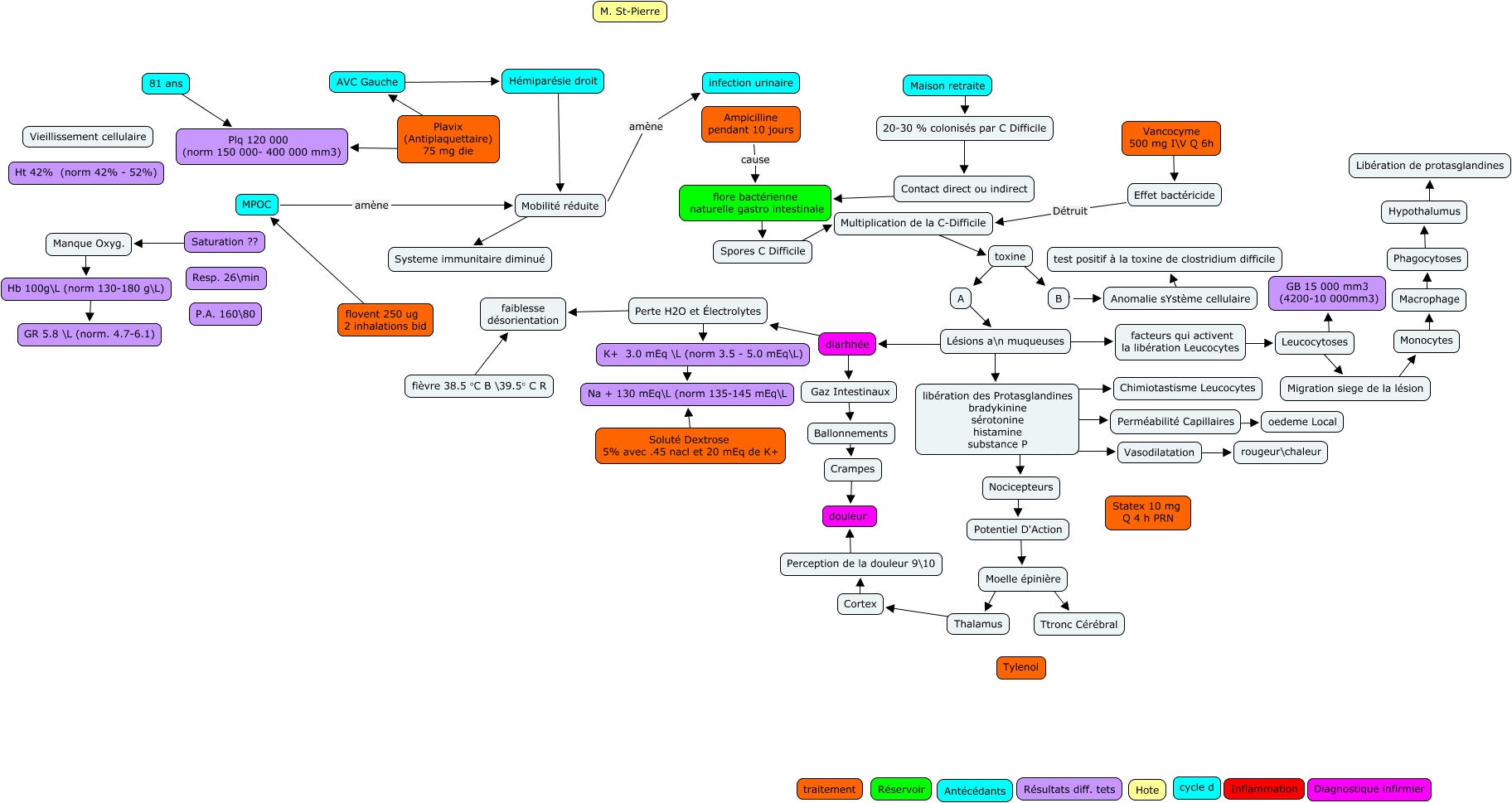 Cette carte de concepts créée avec IHMC CmapTools traite de: SHEMASMCSTPIERRE, A ???? Lésions a\n muqueuses, Vancocyme 500 mg I\V Q 6h ???? Effet bactéricide, libération des Protasglandines bradykinine sérotonine histamine substance P ???? Chimiotastisme Leucocytes, B ???? Anomalie sYstème cellulaire, Manque Oxyg. ???? Hb 100g\L (norm 130-180 g\L), fièvre 38.5 °C B \39.5° C R ???? faiblesse désorientation, Leucocytoses ???? Migration siege de la lésion, Lésions a\n muqueuses ???? facteurs qui activent la libération Leucocytes, Soluté Dextrose 5% avec .45 nacl et 20 mEq de K+ ???? Na + 130 mEq\L (norm 135-145 mEq\L, Effet bactéricide Détruit Multiplication de la C-Difficile, Multiplication de la C-Difficile ???? toxine, diarhhée ???? Perte H2O et Électrolytes, Plavix (Antiplaquettaire) 75 mg die ???? Plq 120 000 (norm 150 000- 400 000 mm3), Leucocytoses ???? GB 15 000 mm3 (4200-10 000mm3), Ballonnements ???? Crampes, diarhhée ???? Gaz Intestinaux, Migration siege de la lésion ???? Monocytes, libération des Protasglandines bradykinine sérotonine histamine substance P ???? Vasodilatation, flore bactérienne naturelle gastro intestinale ???? Spores C Difficile, Perte H2O et Électrolytes ???? faiblesse désorientation