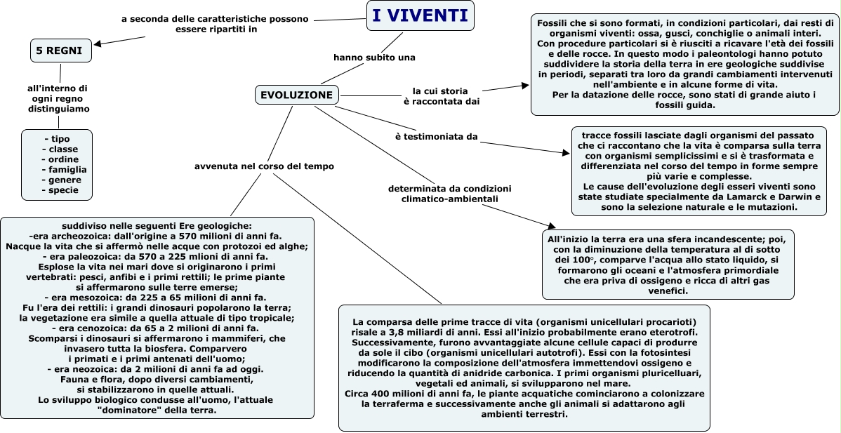 Questa Cmap, creata con IHMC CmapTools, contiene informazioni relative a: I VIVENTI, EVOLUZIONE la cui storia è raccontata dai Fossili che si sono formati, in condizioni particolari, dai resti di organismi viventi: ossa, gusci, conchiglie o animali interi. Con procedure particolari si è riusciti a ricavare l'età dei fossili e delle rocce. In questo modo i paleontologi hanno potuto suddividere la storia della terra in ere geologiche suddivise in periodi, separati tra loro da grandi cambiamenti intervenuti nell'ambiente e in alcune forme di vita. Per la datazione delle rocce, sono stati di grande aiuto i fossili guida., EVOLUZIONE avvenuta nel corso del tempo suddiviso nelle seguenti Ere geologiche: -era archeozoica: dall'origine a 570 milioni di anni fa. Nacque la vita che si affermò nelle acque con protozoi ed alghe; - era paleozoica: da 570 a 225 mlioni di anni fa. Esplose la vita nei mari dove si originarono i primi vertebrati: pesci, anfibi e i primi rettili; le prime piante si affermarono sulle terre emerse; - era mesozoica: da 225 a 65 milioni di anni fa. Fu l'era dei rettili: i grandi dinosauri popolarono la terra; la vegetazione era simile a quella attuale di tipo tropicale; - era cenozoica: da 65 a 2 milioni di anni fa. Scomparsi i dinosauri si affermarono i mammiferi, che invasero tutta la biosfera. Comparvero i primati e i primi antenati dell'uomo; - era neozoica: da 2 milioni di anni fa ad oggi. Fauna e flora, dopo diversi cambiamenti, si stabilizzarono in quelle attuali. Lo sviluppo biologico condusse all'uomo, l'attuale "dominatore" della terra., 5 REGNI all'interno di ogni regno distinguiamo - tipo - classe - ordine - famiglia - genere - specie, I VIVENTI hanno subito una EVOLUZIONE, I VIVENTI a seconda delle caratteristiche possono essere ripartiti in 5 REGNI, EVOLUZIONE avvenuta nel corso del tempo La comparsa delle prime tracce di vita (organismi unicellulari procarioti) risale a 3,8 miliardi di anni. Essi all'inizio probabilmente erano eterotrofi. Successivamente, furono avvantaggiate alcune cellule capaci di produrre da sole il cibo (organismi unicellulari autotrofi). Essi con la fotosintesi modificarono la composizione dell'atmosfera immettendovi ossigeno e riducendo la quantità di anidride carbonica. I primi organismi pluricelluari, vegetali ed animali, si svilupparono nel mare. Circa 400 milioni di anni fa, le piante acquatiche cominciarono a colonizzare la terraferma e successivamente anche gli animali si adattarono agli ambienti terrestri., EVOLUZIONE determinata da condizioni climatico-ambientali All'inizio la terra era una sfera incandescente; poi, con la diminuzione della temperatura al di sotto dei 100°, comparve l'acqua allo stato liquido, si formarono gli oceani e l'atmosfera primordiale che era priva di ossigeno e ricca di altri gas venefici., EVOLUZIONE è testimoniata da tracce fossili lasciate dagli organismi del passato che ci raccontano che la vita è comparsa sulla terra con organismi semplicissimi e si è trasformata e differenziata nel corso del tempo in forme sempre più varie e complesse. Le cause dell'evoluzione degli esseri viventi sono state studiate specialmente da Lamarck e Darwin e sono la selezione naturale e le mutazioni.