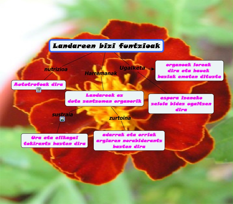 Este Cmap, tiene información relacionada con: landarea alba, Landareek ez dute zentzumen organorik zurtoina adarrak eta orriak argiaren norabiderantz hazten dira, Landareen bizi funtzioak Ugalketa organoak loreak dira eta hauek haziak ematen dituzte, Landareen bizi funtzioak Harremanak Landareek ez dute zentzumen organorik, Landareen bizi funtzioak Ugalketa espora izeneko zelula bidez ugaltzen dira, Landareek ez dute zentzumen organorik sustraia Ura eta elikagai tokirantz hazten dira, Landareen bizi funtzioak nutrizioa Autotrofoak dira