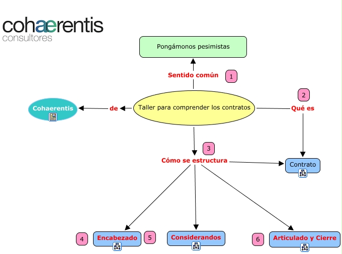 Este Cmap, tiene información relacionada con: Estructura del taller, Taller para comprender los contratos Cómo se estructura Considerandos, Taller para comprender los contratos Cómo se estructura Encabezado, Taller para comprender los contratos Qué es Contrato, Taller para comprender los contratos Sentido común Pongámonos pesimistas, Taller para comprender los contratos de Cohaerentis, Taller para comprender los contratos Cómo se estructura Articulado y Cierre, Taller para comprender los contratos Cómo se estructura Contrato