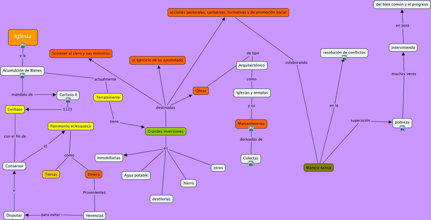 Este Cmap, tiene información relacionada con: Religión, Grandes inversiones en hierro, Carlixto II 1123 Celibato, Grandes inversiones en destilerías, interviniendo en post del bien común y el progreso, Terrateniente tiene Grandes inversiones, Acumulción de Bienes actualmente Terrateniente, Conservar el Patrimonio eclesiastico, acciones pastorales, caritativas, formativas y de promoción social colaborando Manera Activa, pobreza muchas veces interviniendo, Acumulción de Bienes mandato de Carlixto II, Celibato con el fin de Conservar, Obras de tipo Arquitectónico, Grandes inversiones en otros, Manera Activa superación pobreza, Herencias para evitar Disputas, Iglesia y la Acumulción de Bienes, Dinero Provenientes Herencias, Grandes inversiones destinadas Sostener al clero y sus ministros, Grandes inversiones en Inmobiliarias, Disputas y Conservar