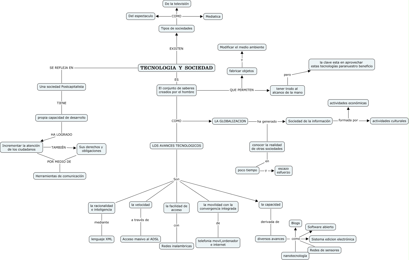 Este Cmap, tiene información relacionada con: TECNOLOGIA Y SOCIEDAD- ANGELA, diversos avances como Software abierto, fabricar objetos Y Modificar el medio ambiente, LOS AVANCES TECNOLOGICOS Son la velocidad, TECNOLOGIA Y SOCIEDAD EXISTEN Tipos de sociedades, Una sociedad Postcapitalista TIENE propia capacidad de desarrollo, la capacidad derivada de diversos avances, diversos avances como Redes de sensores, El conjunto de saberes creados por el hombre QUE PERMITEN tener trodo al alcance de la mano, poco tiempo y escazo esfuerzo, LOS AVANCES TECNOLOGICOS Son la facilidad de acceso, diversos avances como nanotecnología, LA GLOBALIZACION ha generado conocer la realidad de otras sociedades, Sociedad de la información formada por actividades culturales, LOS AVANCES TECNOLOGICOS Son la racionalidad e inteligencia, Sociedad de la información formada por actividades económicas, TECNOLOGIA Y SOCIEDAD ES El conjunto de saberes creados por el hombre, Tipos de sociedades COMO Mediatica, la racionalidad e inteligencia mediante lenguaje XML, LOS AVANCES TECNOLOGICOS Son la movilidad con la convergencia integrada, diversos avances como Blogs