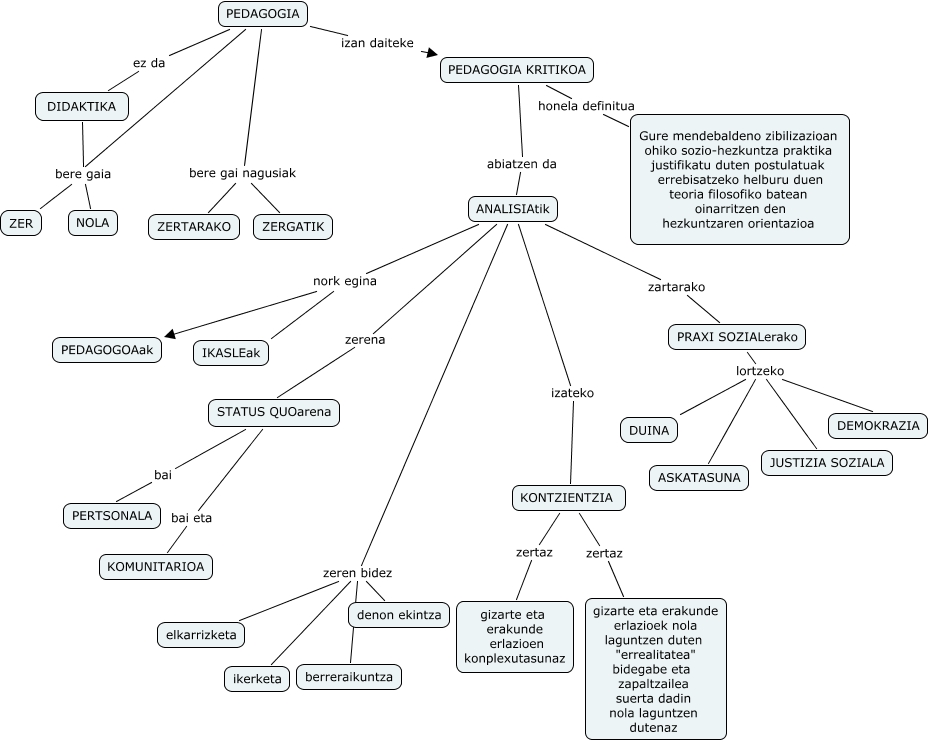 Este Cmap, tiene información relacionada con: 1 pedagogia kritikoa, ANALISIAtik zartarako PRAXI SOZIALerako, STATUS QUOarena bai PERTSONALA, PRAXI SOZIALerako lortzeko JUSTIZIA SOZIALA, STATUS QUOarena bai eta KOMUNITARIOA, ANALISIAtik zerena STATUS QUOarena, ANALISIAtik nork egina IKASLEak, PRAXI SOZIALerako lortzeko DEMOKRAZIA, PEDAGOGIA KRITIKOA honela definitua Gure mendebaldeno zibilizazioan ohiko sozio-hezkuntza praktika justifikatu duten postulatuak errebisatzeko helburu duen teoria filosofiko batean oinarritzen den hezkuntzaren orientazioa, PRAXI SOZIALerako lortzeko DUINA, ANALISIAtik zeren bidez denon ekintza, ANALISIAtik nork egina PEDAGOGOAak, KONTZIENTZIA zertaz gizarte eta erakunde erlazioek nola laguntzen duten "errealitatea" bidegabe eta zapaltzailea suerta dadin nola laguntzen dutenaz, DIDAKTIKA bere gaia NOLA, PEDAGOGIA izan daiteke PEDAGOGIA KRITIKOA, PEDAGOGIA bere gai nagusiak ZERGATIK, ANALISIAtik zeren bidez berreraikuntza, PEDAGOGIA bere gai nagusiak ZERTARAKO, PEDAGOGIA bere gaia ZER, PEDAGOGIA KRITIKOA abiatzen da ANALISIAtik, PRAXI SOZIALerako lortzeko ASKATASUNA