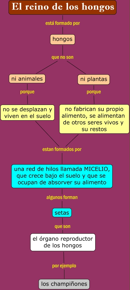 Este Cmap, tiene información relacionada con: El reino de los hongos, no fabrican su propio alimento, se alimentan de otros seres vivos y su restos estan formados por una red de hilos llamada MICELIO, que crece bajo el suelo y que se ocupan de absorver su alimento, ni animales porque no se desplazan y viven en el suelo, hongos que no son ni animales, hongos que no son ni plantas, una red de hilos llamada MICELIO, que crece bajo el suelo y que se ocupan de absorver su alimento algunos forman setas, no se desplazan y viven en el suelo estan formados por una red de hilos llamada MICELIO, que crece bajo el suelo y que se ocupan de absorver su alimento, setas que son el órgano reproductor de los hongos, el órgano reproductor de los hongos por ejemplo los champiñones, El reino de los hongos está formado por hongos, ni plantas porque no fabrican su propio alimento, se alimentan de otros seres vivos y su restos