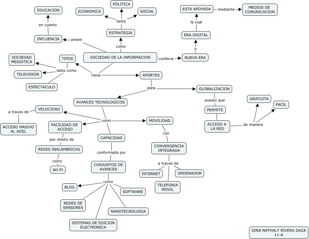 Este Cmap, tiene información relacionada con: TECNOLOGIA Y SOCIEDAD... GINA RIVERA, CONVERGENCIA INTEGRADA a traves de INTERNET, REDES INALAMBRICAS como WI-FI, SOCIEDAD DE LA INFORMACION posee INFLUENCIA, TIPOS tales como SOCIEDAD MEDIATICA, NANOTECNOLOGIA como SOFTWARE, ESTA APOYADA mediante MEDIOS DE COMUNICACION, AVANCES TECNOLOGICOS como CAPACIDAD, GLOBALIZACION puesto que PERMITE, SOCIEDAD DE LA INFORMACION tiene TIPOS, NANOTECNOLOGIA como BLOG, SOCIEDAD DE LA INFORMACION conlleva NUEVA ERA, ESTRATEGIA tanto POLITICA, MOVILIDAD con CONVERGENCIA INTEGRADA, ESTRATEGIA tanto SOCIAL, NUEVA ERA o ERA DIGITAL, CONJUNTOS DE AVANCES como SISTEMAS DE EDICION ELECTRONICA, CONVERGENCIA INTEGRADA a traves de ORDENADOR, CONJUNTOS DE AVANCES como SOFTWARE, NANOTECNOLOGIA como REDES DE SENSORES, ESTRATEGIA tanto ECONOMICA