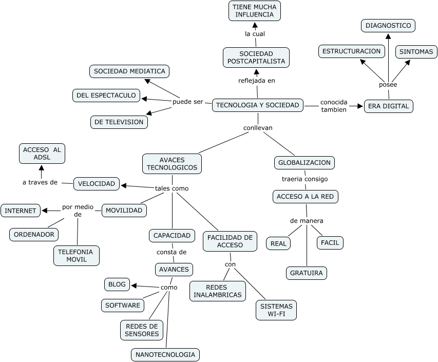 Este Cmap, tiene información relacionada con: TANIA ALVARADO. TECNOLOGIA Y SOCIEDAD, TECNOLOGIA Y SOCIEDAD puede ser SOCIEDAD MEDIATICA, AVACES TECNOLOGICOS tales como VELOCIDAD, MOVILIDAD por medio de TELEFONIA MOVIL, VELOCIDAD a traves de ACCESO AL ADSL, ERA DIGITAL posee ESTRUCTURACION, TECNOLOGIA Y SOCIEDAD puede ser DE TELEVISION, ACCESO A LA RED de manera FACIL, AVANCES como REDES DE SENSORES, AVANCES como SOFTWARE, MOVILIDAD por medio de ORDENADOR, FACILIDAD DE ACCESO con SISTEMAS WI-FI, TECNOLOGIA Y SOCIEDAD conllevan GLOBALIZACION, ERA DIGITAL posee SINTOMAS, MOVILIDAD por medio de INTERNET, AVACES TECNOLOGICOS tales como CAPACIDAD, ERA DIGITAL posee DIAGNOSTICO, TECNOLOGIA Y SOCIEDAD reflejada en SOCIEDAD POSTCAPITALISTA, GLOBALIZACION traeria consigo ACCESO A LA RED, CAPACIDAD consta de AVANCES, AVANCES como NANOTECNOLOGIA
