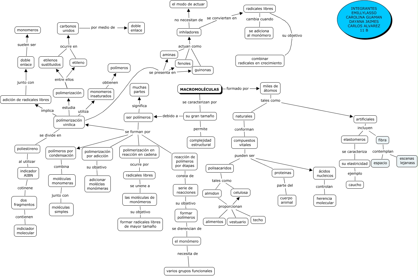 Este Cmap, tiene información relacionada con: macromoléculas, su gran tamaño permite complejidad estructural, MACROMOLÉCULAS se caracterizan por su gran tamaño, polímerización vinilica se presenta en guinonas, reacción de polímeros por étapas consta de serie de reacciones, polímerización vinilica se presenta en fenoles, polimerización etilenos sustituidos, compuestos vitales pueden ser polisacaridos, doble enlace suelen ser monomeros, radicales libres su objetivo combinar radicales en crecimiento, almidon proporcionan celulosa, ser polímeros se forman por polímeros por condensación, polímerización vinilica se divide en poliestireno, polímerización vinilica estudia polimerización, ser polímeros se forman por polimerización por adicción, radicales libres se unene a las moléculas de monómeros, fibra contemplan espacio, fibra contemplan escenas lejanass, inhiladores se convierten en radicales libres, polímerización vinilica se presenta en aminas, almidon proporcionan alimentos