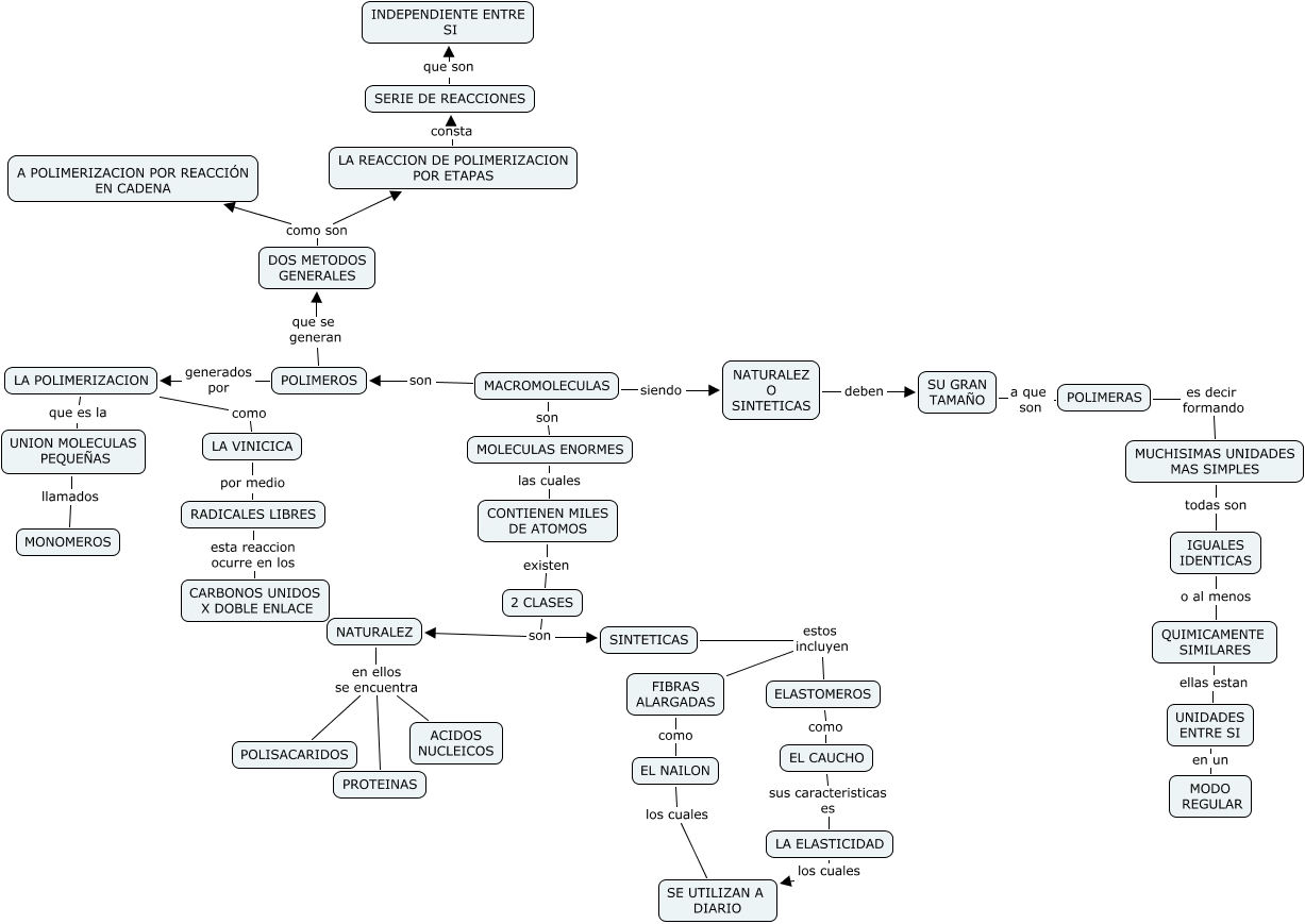 Este Cmap, tiene información relacionada con: macromoleculas, NATURALEZ en ellos se encuentra PROTEINAS, ELASTOMEROS como EL CAUCHO, MUCHISIMAS UNIDADES MAS SIMPLES todas son IGUALES IDENTICAS, LA POLIMERIZACION que es la UNION MOLECULAS PEQUEÑAS, CONTIENEN MILES DE ATOMOS existen 2 CLASES, MOLECULAS ENORMES las cuales CONTIENEN MILES DE ATOMOS, DOS METODOS GENERALES como son A POLIMERIZACION POR REACCIÓN EN CADENA, QUIMICAMENTE SIMILARES ellas estan UNIDADES ENTRE SI, UNION MOLECULAS PEQUEÑAS llamados MONOMEROS, LA VINICICA por medio RADICALES LIBRES, EL NAILON los cuales SE UTILIZAN A DIARIO, NATURALEZ en ellos se encuentra ACIDOS NUCLEICOS, MACROMOLECULAS son MOLECULAS ENORMES, RADICALES LIBRES esta reaccion ocurre en los CARBONOS UNIDOS X DOBLE ENLACE, NATURALEZ en ellos se encuentra POLISACARIDOS, EL CAUCHO sus caracteristicas es LA ELASTICIDAD, 2 CLASES son SINTETICAS, MACROMOLECULAS son POLIMEROS, SU GRAN TAMAÑO a que son POLIMERAS, MACROMOLECULAS siendo NATURALEZ O SINTETICAS