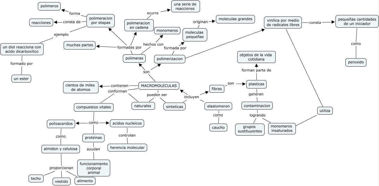 Este Cmap, tiene información relacionada con: MACROMOLECULAS 11 B, pequeñas cantidades de un iniciador como peroxido, MACROMOLECULAS contienen cientos de miles de atomos, MACROMOLECULAS son polimeras, polimeracion por etapas ejemplo un diol reacciona con acido dicarboxilico, sinteticas incluyen MACROMOLECULAS, moleculas pequeñas originan moleculas grandes, compuestos vitales como acidos nucleicos, polimerizacion ???? vinilica por medio de radicales libres, sinteticas incluyen fibras, MACROMOLECULAS pueden ser sinteticas, compuestos vitales como proteinas, plasticas forman parte de objetos de la vida cotidiana, polimeracion por etapas forma polimeros, almidon y celulosa proporcionan alimento, vinilica por medio de radicales libres utiliza utiliza, MACROMOLECULAS conforman compuestos vitales, fibras son plasticas, utiliza ???? ????, polimeras formadas por polimeracion por etapas, acidos nucleicos controlan herencia molecular
