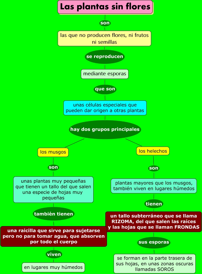 Este Cmap, tiene información relacionada con: Las plantas sin flores, unas células especiales que pueden dar origen a otras plantas hay dos grupos principales los helechos, una raicilla que sirve para sujetarse pero no para tomar agua, que absorven por todo el cuerpo viven en lugares muy húmedos, plantas mayores que los musgos, también viven en lugares húmedos tienen un tallo subterráneo que se llama RIZOMA, del que salen las raíces y las hojas que se llaman FRONDAS, unas células especiales que pueden dar origen a otras plantas hay dos grupos principales los musgos, unas plantas muy pequeñas que tienen un tallo del que salen una especie de hojas muy pequeñas también tienen una raicilla que sirve para sujetarse pero no para tomar agua, que absorven por todo el cuerpo, un tallo subterráneo que se llama RIZOMA, del que salen las raíces y las hojas que se llaman FRONDAS sus esporas se forman en la parte trasera de sus hojas, en unas zonas oscuras llamadas SOROS, Las plantas sin flores son las que no producen flores, ni frutos ni semillas, las que no producen flores, ni frutos ni semillas se reproducen mediante esporas, los helechos son plantas mayores que los musgos, también viven en lugares húmedos, mediante esporas que son unas células especiales que pueden dar origen a otras plantas, los musgos son unas plantas muy pequeñas que tienen un tallo del que salen una especie de hojas muy pequeñas