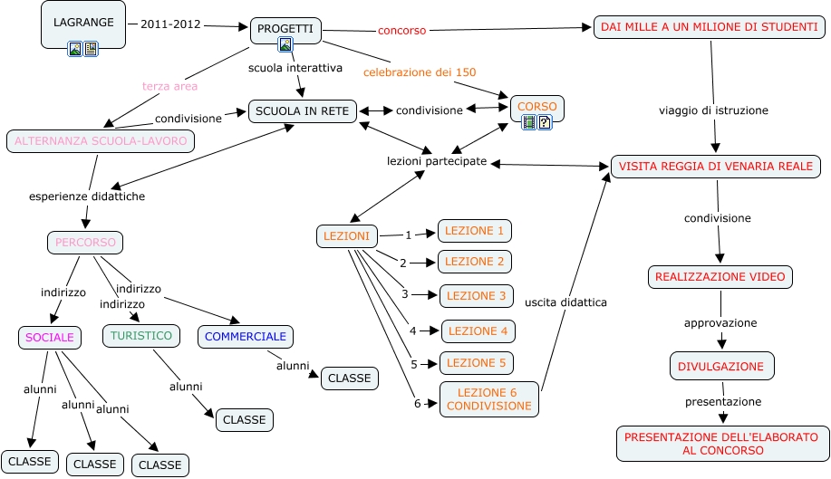 Questa Cmap, creata con IHMC CmapTools, contiene informazioni relative a: PROGETTI, REALIZZAZIONE VIDEO approvazione DIVULGAZIONE, PROGETTI scuola interattiva SCUOLA IN RETE, DAI MILLE A UN MILIONE DI STUDENTI viaggio di istruzione VISITA REGGIA DI VENARIA REALE, DIVULGAZIONE presentazione PRESENTAZIONE DELL'ELABORATO AL CONCORSO, LAGRANGE 2011-2012 PROGETTI, SOCIALE alunni CLASSE, SCUOLA IN RETE esperienze didattiche PERCORSO, SOCIALE alunni CLASSE, PERCORSO indirizzo TURISTICO, LEZIONI 4 LEZIONE 4, PROGETTI terza area ALTERNANZA SCUOLA-LAVORO, VISITA REGGIA DI VENARIA REALE lezioni partecipate LEZIONI, LEZIONI 2 LEZIONE 2, PERCORSO indirizzo SOCIALE, PROGETTI celebrazione dei 150 CORSO, PROGETTI concorso DAI MILLE A UN MILIONE DI STUDENTI, PERCORSO indirizzo COMMERCIALE, LEZIONI 6 LEZIONE 6 CONDIVISIONE, COMMERCIALE alunni CLASSE, TURISTICO alunni CLASSE