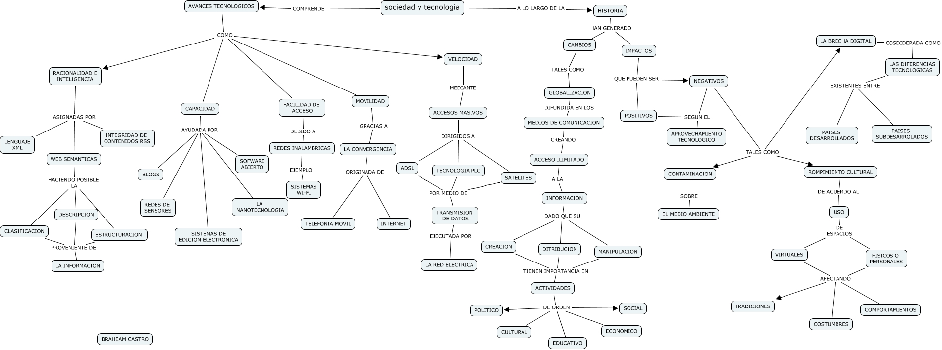 Este Cmap, tiene información relacionada con: BRAHEAM CASTRO SOCIEDAD Y TECNOLOGIA, RACIONALIDAD E INTELIGENCIA ASIGNADAS POR WEB SEMANTICAS, TECNOLOGIA PLC POR MEDIO DE TRANSMISION DE DATOS, AVANCES TECNOLOGICOS COMO CAPACIDAD, REDES INALAMBRICAS EJEMPLO SISTEMAS WI-FI, CONTAMINACION SOBRE EL MEDIO AMBIENTE, VIRTUALES AFECTANDO TRADICIONES, INFORMACION DADO QUE SU MANIPULACION, sociedad y tecnologia A LO LARGO DE LA HISTORIA, LA CONVERGENCIA ORIGINADA DE INTERNET, ACCESOS MASIVOS DIRIGIDOS A SATELITES, NEGATIVOS TALES COMO ROMPIMIENTO CULTURAL, HISTORIA HAN GENERADO IMPACTOS, FISICOS O PERSONALES AFECTANDO COMPORTAMIENTOS, CAPACIDAD AYUDADA POR SOFWARE ABIERTO, USO DE ESPACIOS FISICOS O PERSONALES, CAPACIDAD AYUDADA POR REDES DE SENSORES, USO DE ESPACIOS VIRTUALES, TRANSMISION DE DATOS EJECUTADA POR LA RED ELECTRICA, CAPACIDAD AYUDADA POR BLOGS, WEB SEMANTICAS HACIENDO POSIBLE LA ESTRUCTURACION