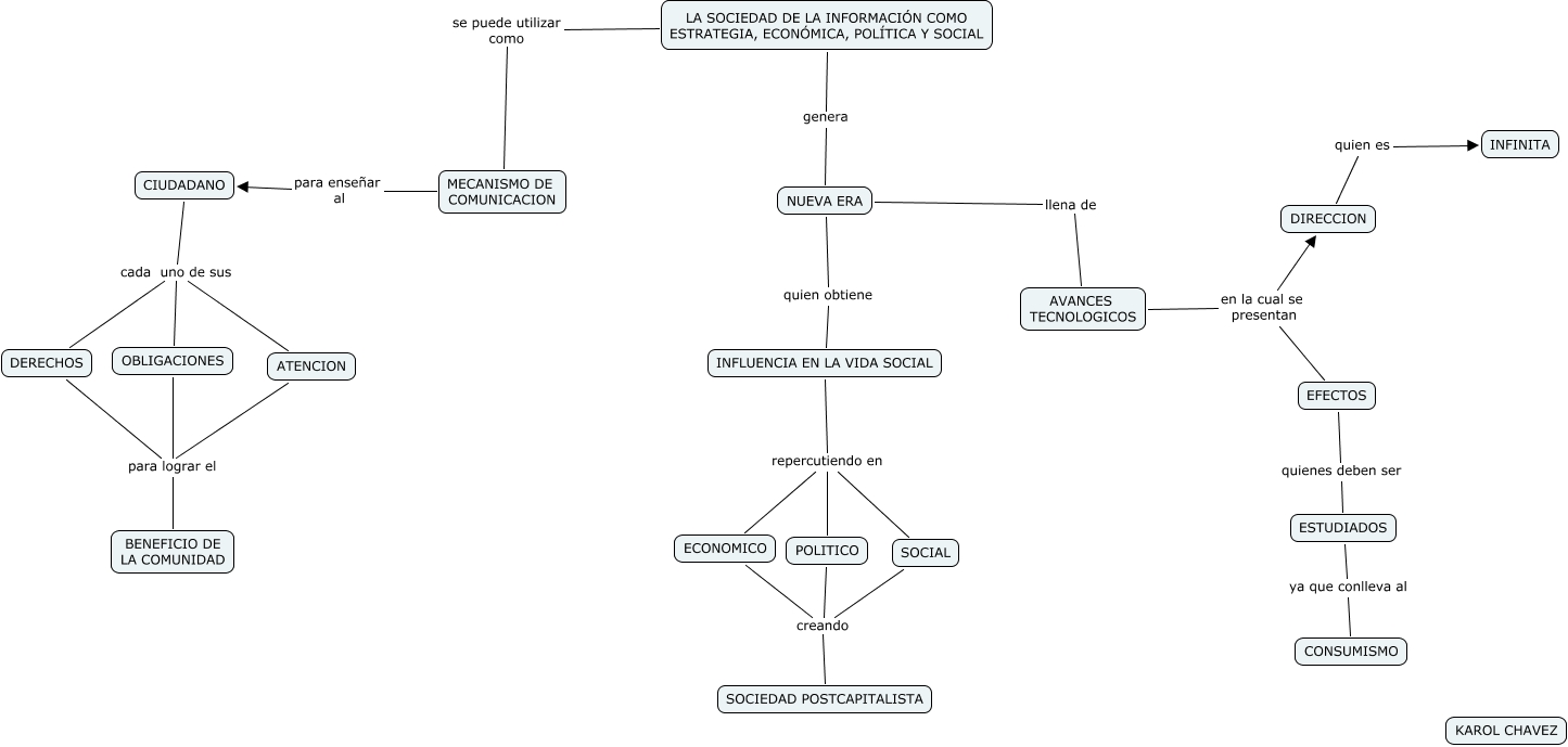 Este Cmap, tiene información relacionada con: informatica, INFLUENCIA EN LA VIDA SOCIAL repercutiendo en SOCIAL, ECONOMICO creando SOCIEDAD POSTCAPITALISTA, LA SOCIEDAD DE LA INFORMACIÓN COMO ESTRATEGIA, ECONÓMICA, POLÍTICA Y SOCIAL se puede utilizar como MECANISMO DE COMUNICACION, MECANISMO DE COMUNICACION para enseñar al CIUDADANO, CIUDADANO cada uno de sus ATENCION, DERECHOS para lograr el BENEFICIO DE LA COMUNIDAD, CIUDADANO cada uno de sus DERECHOS, EFECTOS quienes deben ser ESTUDIADOS, AVANCES TECNOLOGICOS en la cual se presentan EFECTOS, INFLUENCIA EN LA VIDA SOCIAL repercutiendo en POLITICO, LA SOCIEDAD DE LA INFORMACIÓN COMO ESTRATEGIA, ECONÓMICA, POLÍTICA Y SOCIAL genera NUEVA ERA, DIRECCION quien es INFINITA, AVANCES TECNOLOGICOS en la cual se presentan DIRECCION, INFLUENCIA EN LA VIDA SOCIAL repercutiendo en ECONOMICO, OBLIGACIONES para lograr el BENEFICIO DE LA COMUNIDAD, POLITICO creando SOCIEDAD POSTCAPITALISTA, NUEVA ERA llena de AVANCES TECNOLOGICOS, SOCIAL creando SOCIEDAD POSTCAPITALISTA, ESTUDIADOS ya que conlleva al CONSUMISMO, ATENCION para lograr el BENEFICIO DE LA COMUNIDAD